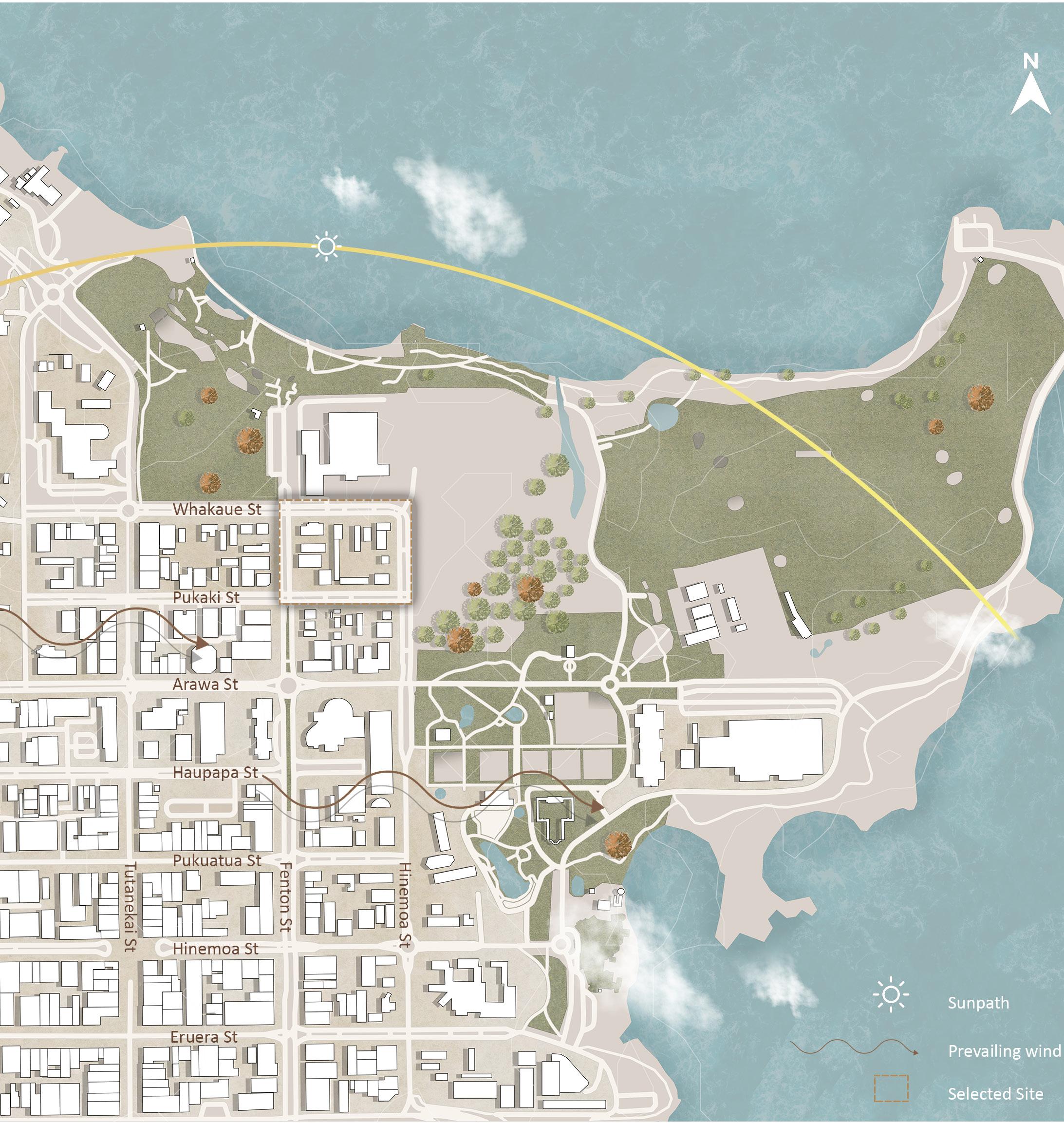 This analysis displays the Rotorua CBD in perspective. The image illustrates both the prevailing wind and the sun's path across the CBD. In this image, the relation between the land and Lake Rotorua is also apparent.