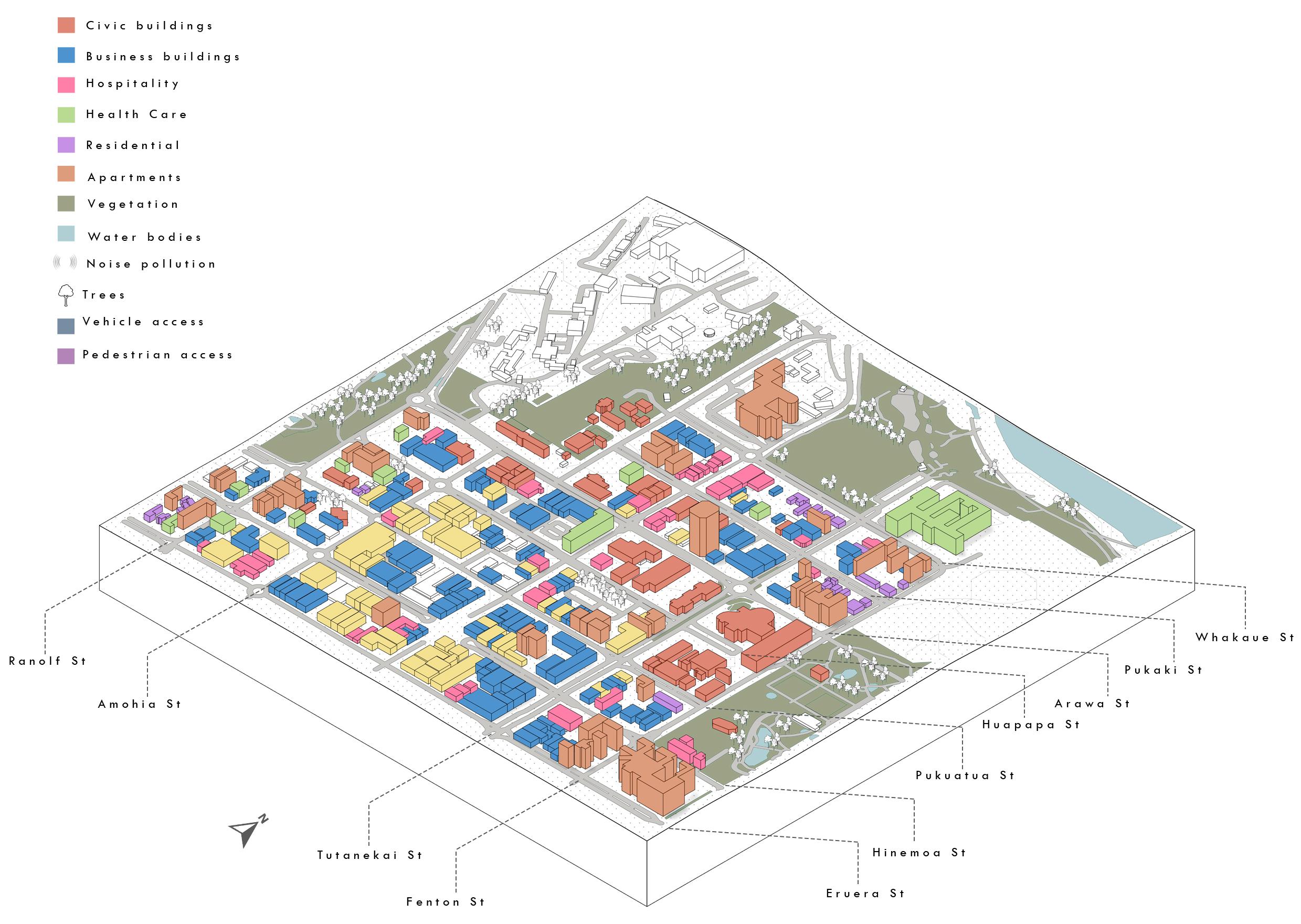 This analysis reveals what the Rotorua CBD is comprised of. The majority of areas are included, covering access routes, vegetation, and building types. This analysis demonstrates that the CBD has a very small amount of residential accommodation. However, this shows the city's potential for residential development and densification. The objective of Rotorua's district revitalisation as a whole is tied to the idea of residential growth. Which is the aim of the brief.