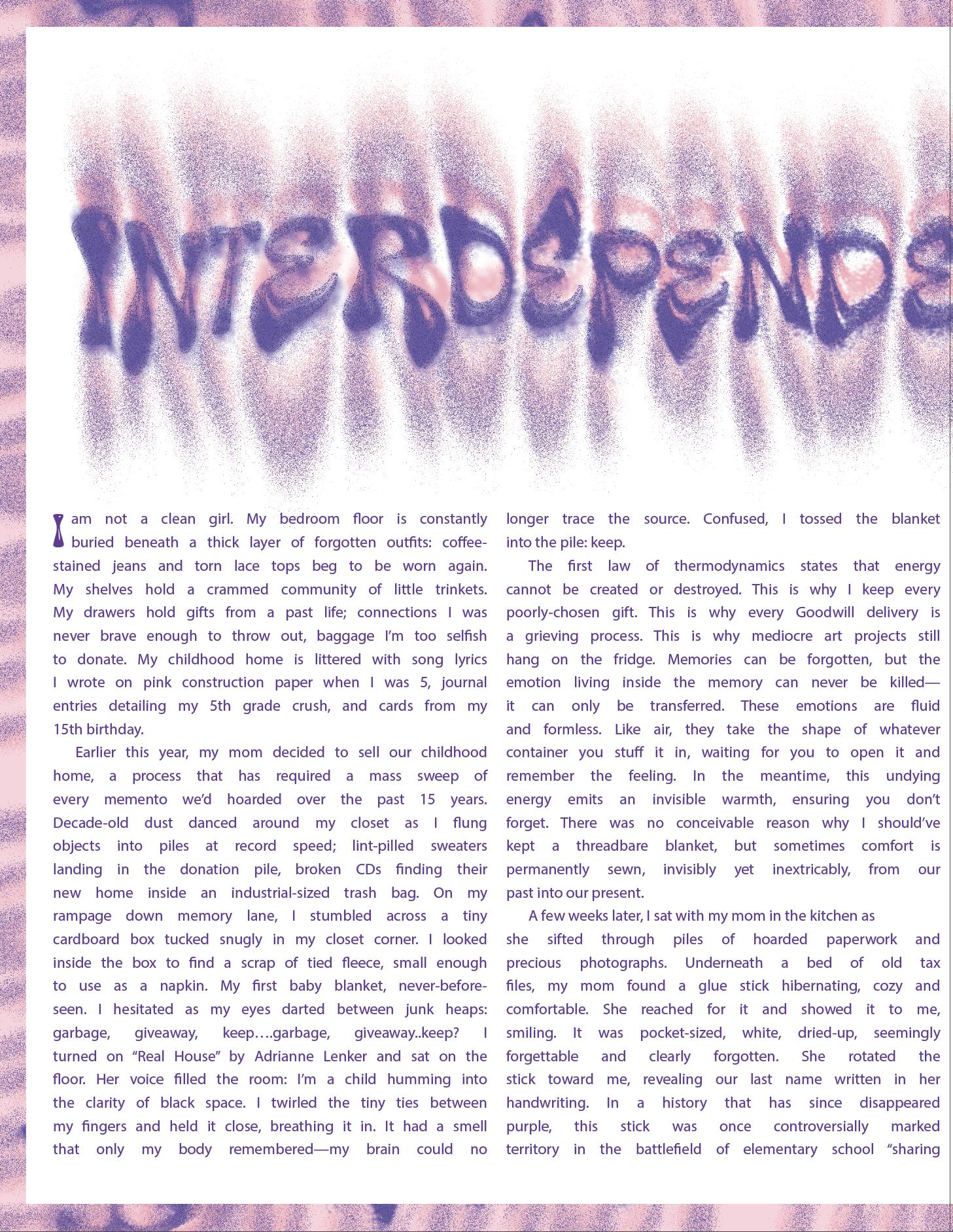 Aswe move through life, many items are left behind. Crumpled receipts from trips to the grocery store, loose buttons from a well-loved sweater, and museum brochures from exhibits that have since been replaced pose the eternal question: keep or throw away? In an effort to maintain a sense of tidiness, we must determine the fate of these items, either finding them a new home in the trash, or allowing them to linger a while longer, not quite ready to part ways. These decisions continuously present themselves in a never-ending cycle, confronting us both in major life changes, as explored in “Interdependent Remnants”, and in our daily routine, as described in “The Subway.”