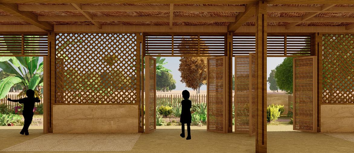 The «open» spaces are formed by the courtyard, the central courtyard and the recreation area which can be either open or closed for the supervision of the children. This space is extended by a pedagogical vegetable garden which allows the children to be introduced to smallscale agriculture. In addition, the outdoor spaces are equipped with furniture integrated into the structure of the walls. Also, the air circulates in a transversal way allowing to air efficiently the inhabited spaces which are generous volumes with a height under ceiling of 3.00 meters.