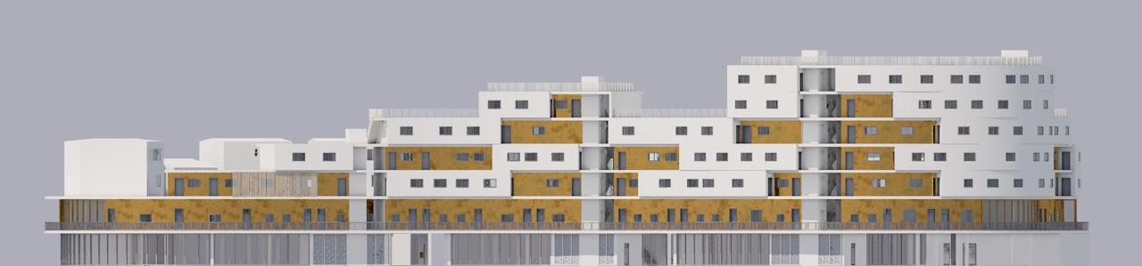 The architectural object is accessed via a large courtyard that allows both coverage and a view of the entire project. It is composed of 3 large volumes arranged around a central courtyard with an extension onto the courtyard, the main access point of the project. The grid of posts defines an exterior circulation space around the central courtyard of the project. This space of circulation makes a transition from the outside and also sends us back to a form of interiority before penetrating into the inhabited volumes. All the spaces in the enclosure define a form that creates an atmosphere, whose system gives us a feeling of security.