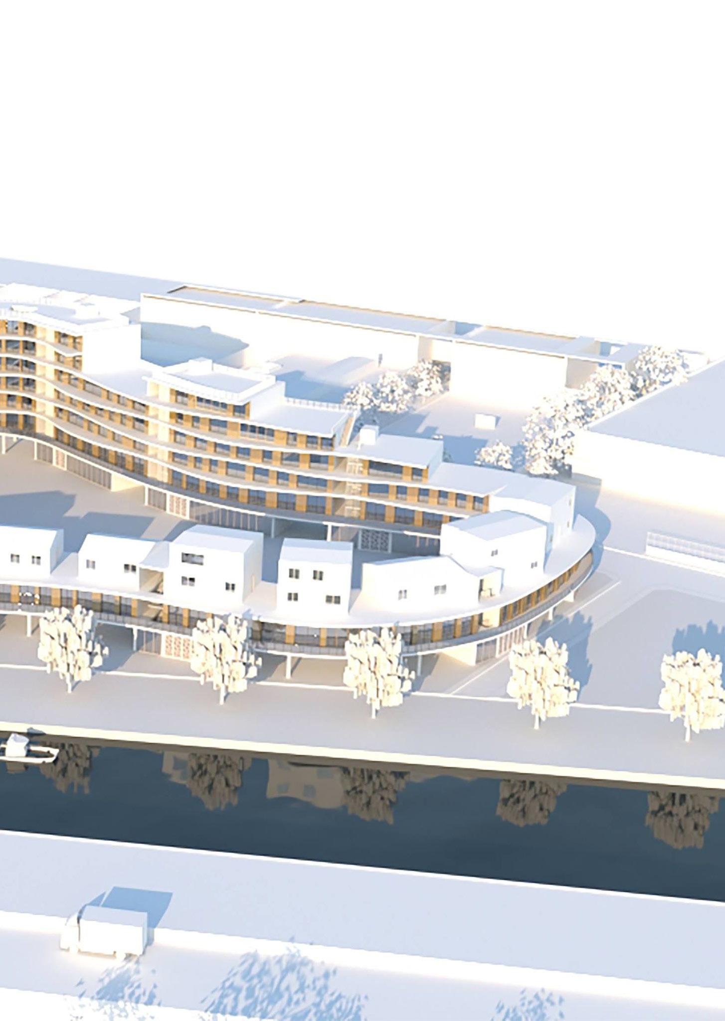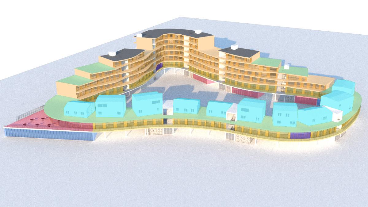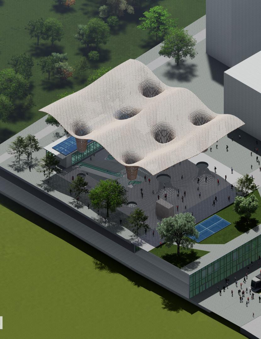 Finally, the project is punctuated by a collective roof that unifies the system and recalls the community aspect of the project. This roof, whose slopes face outwards, is composed of a framework of 46 wooden trusses whose void allows the continuous movement of warm air.