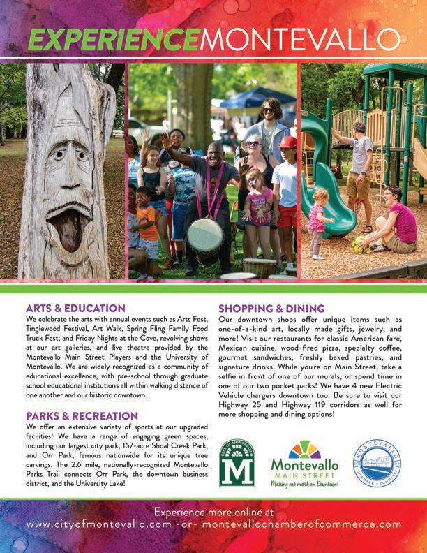 Historic Montevallo is the proud home of the University of Montevallo, American Village and the National Cemetery. A recent streetscape renovation project developed a fully accessible Main Street district with a uniquely historic look and two distinctive pocket parks, and as a result, new businesses abound. Just one block off Main Street, the University of Montevallo has a new Center for the Arts that hosts a myriad of special events. The new Shoal Creek Park is part of the 167acre Mahler estate.Montevallo’s annual events include the spring Arts Fest in Orr Park, Friday Nights at the Cove, Artwalks, Tinglewood Festival, American Village events, holiday parades, College Night and other arts, athletic and culture events at the University of Montevallo. cityofmontevallo.com