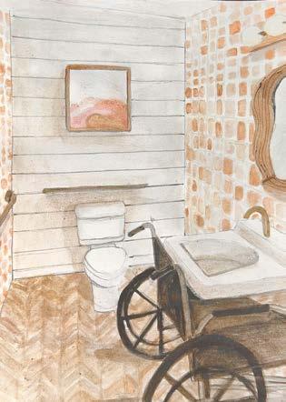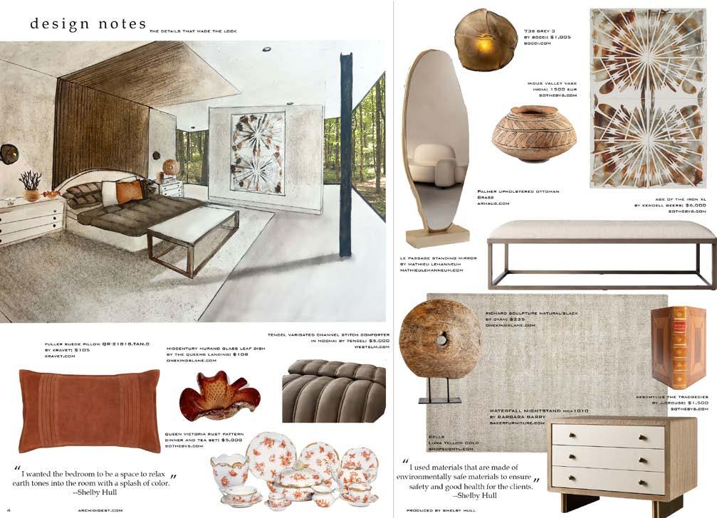 For the house in the Woods by Drake/Anderson, I was required to redesign the interior of the bedroom for a couple. The couple was using the home as a weekend house. I used watercolors to hand render the bedroom, and I also used Photoshop to add in some details.