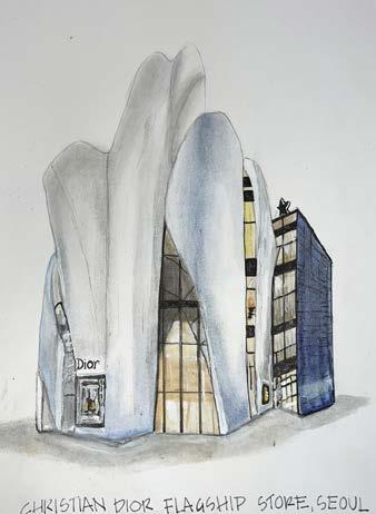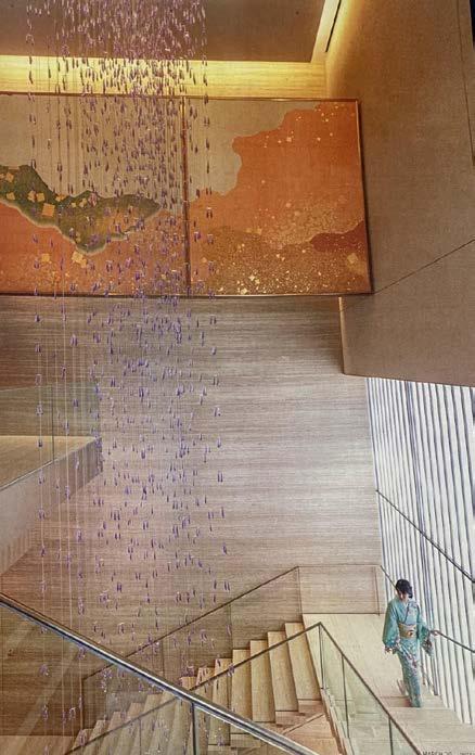 This is an image taken from a magazine (on the right), and a rendering that I made with watercolors (pictured on the left). It is the Okura Tokyo Hotel's lobby. The photograph was taken by Jimmy Cohrssen. The Wisteria chandelier is 40-feet long, and according to "Interior Design", they change it out and put a new one in weekly.