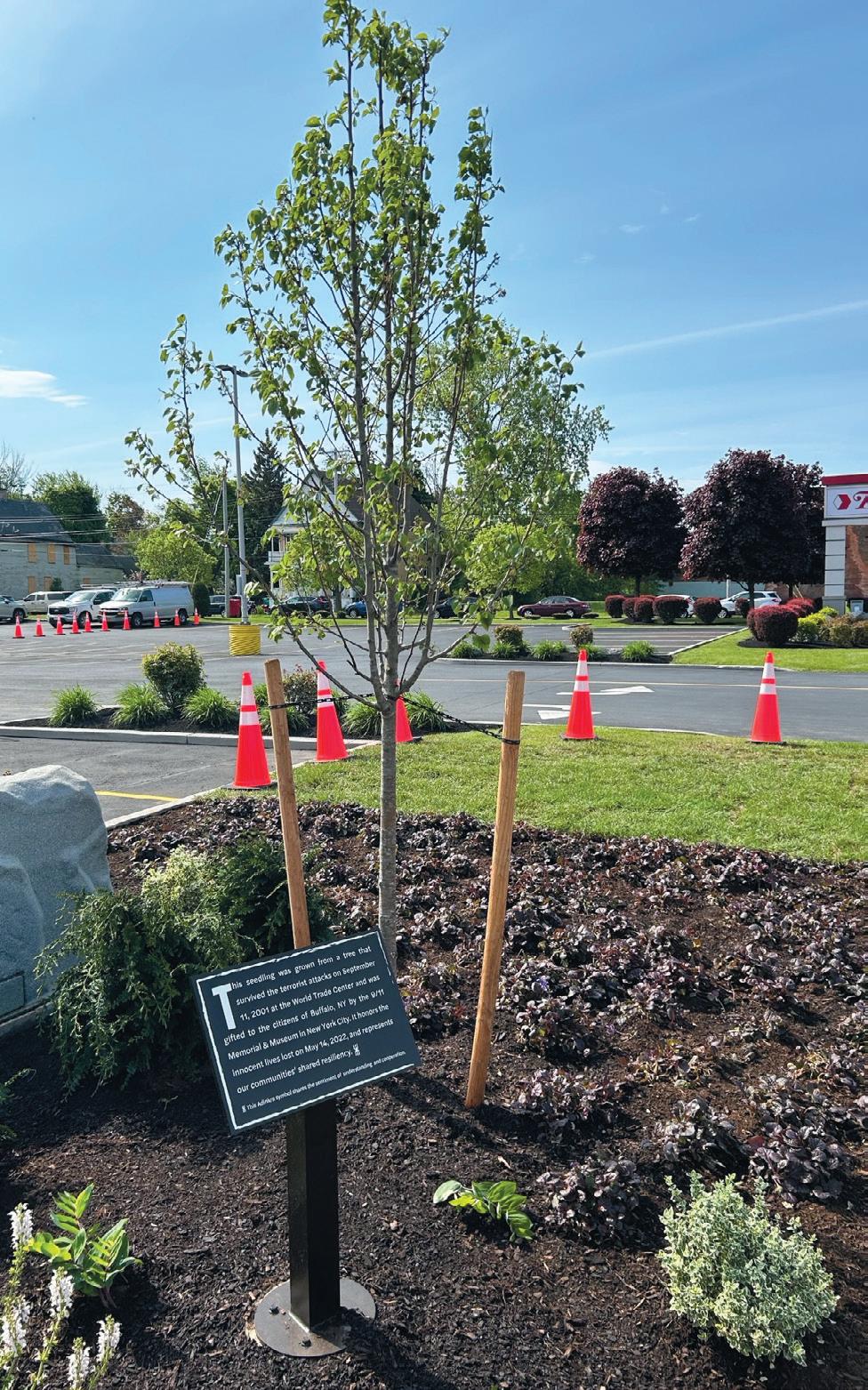 The tree within the memorial is a seedling from the one that survived the 9/11 terrorist attacks. Each year, three communities are selected to receive a seedling as a gift from the 9/11 Commission.