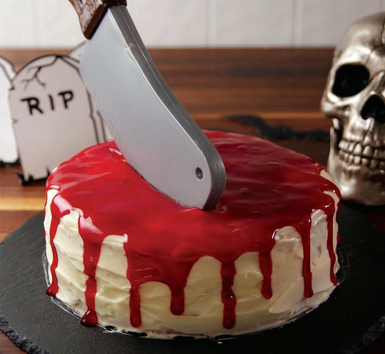Frost the entire outside of the cake with cream cheese frosting, making sure to make an extra smooth layer on top. Pour “blood” on the top and allow some to drip down the sides. Serve.