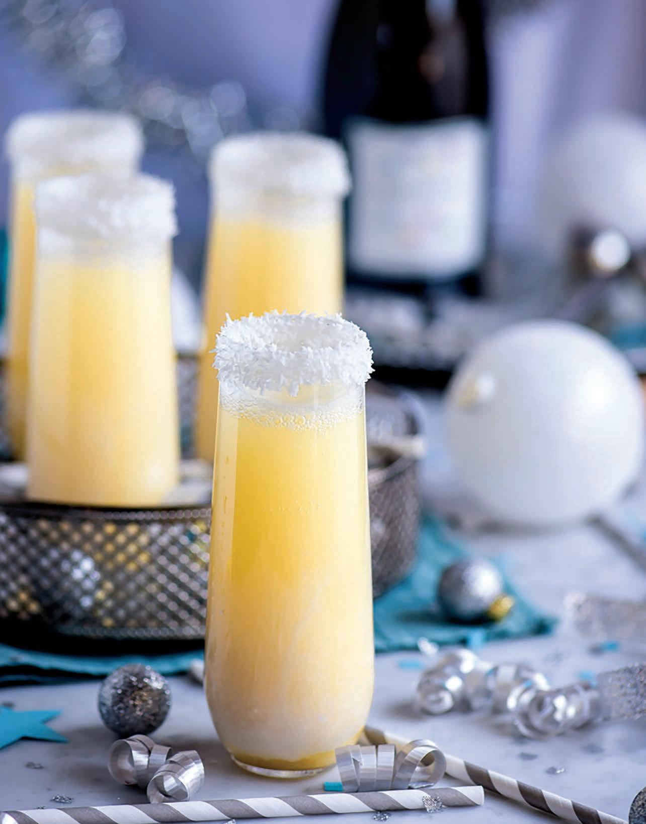 1. Pour some simple syrup in a small bowl and the shredded coconut in another small bowl. Dip the top ¼ or so of your champagne glasses in the simple syrup and then in the shredded coconut making sure the rim is well coated. Set aside to dry a little.