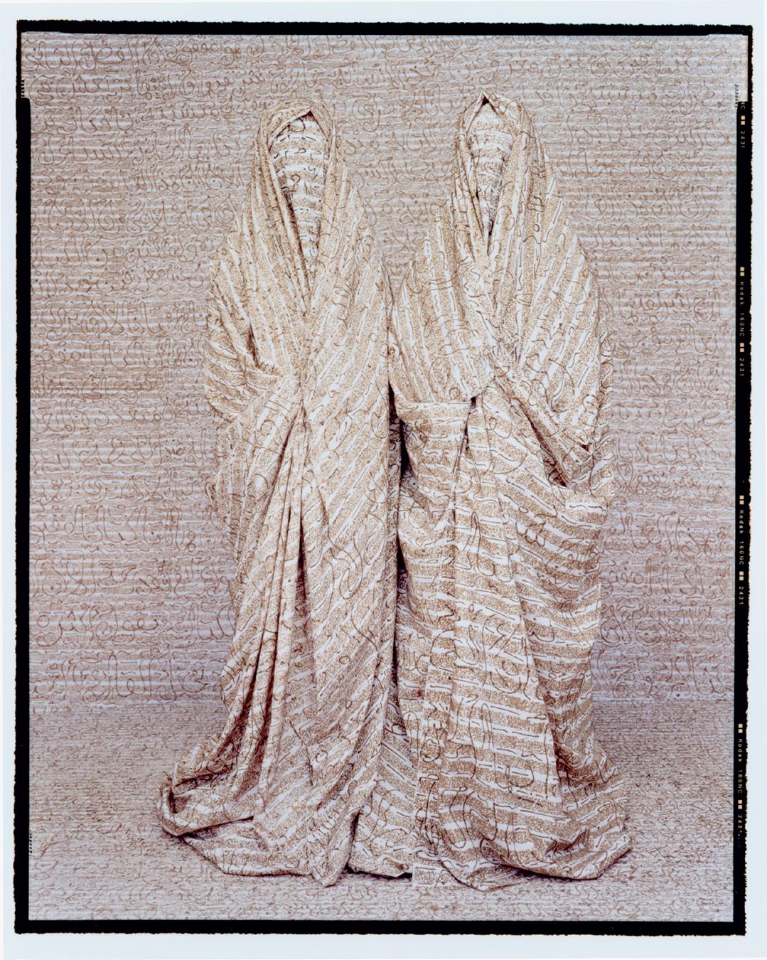 —Lalla Essaydi, from an interview inBy fully cloaking the subjects of her largescale diptychs, Lalla Essaydi disrupts the nineteenth-century Orientalist tradition of overtly sexualizing Arab women through gratuitous nudity. She has covered the fabric that veils these two women and the photographs’ backdrop with Arabic calligraphy using henna, a pigment customarily applied to females to celebrate rites of passage. This painstaking process takes Essaydi more than six months to complete.