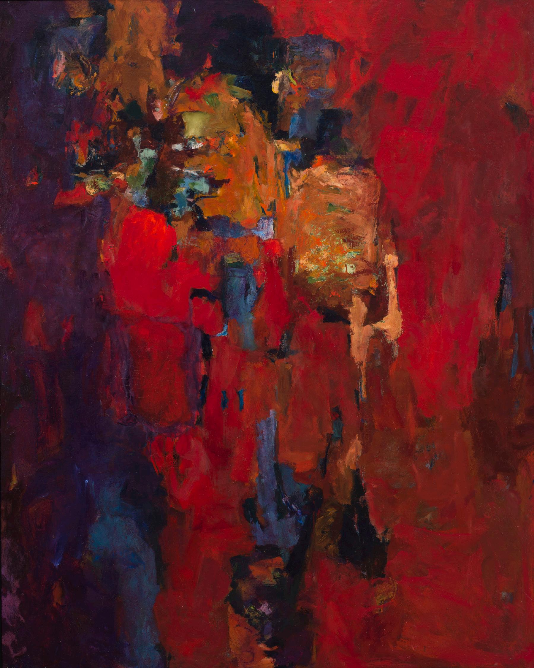 Curiosamente, en un cuadro titulado Rojo, la mayoría de los rectángulos y bordes son de color naranja. Sin embargo, es el azulejo azul celeste de la segunda fila desde arriba el que capta nuestra atención. Se niega a alinearse con los demás, a estar a la misma altura y ser igual que ellos. Hay otros azulejos azules. Justo debajo del que sobresale hay un modesto azulejo azul medianoche a la misma altura que los demás. Debajo de él, en la fila inferior, hay otro de un tono azul celeste más brillante. También se niega a conformarse.