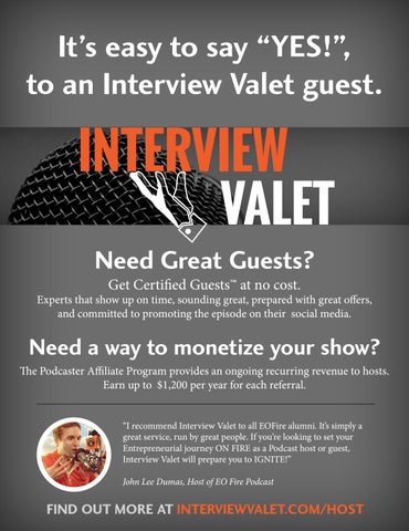 Need a way to monetize your show? The Podcaster Affiliate Program provides an ongoing recurring revenue to hosts. Earn up to $1,200 per year for each referral. “I recommend Interview Valet to all EOFire alumni. It’s simply a great service, run by great people. If you’re looking to set your Entrepreneurial journey ON FIRE as a Podcast host or guest, Interview Valet will prepare you to IGNITE!” John Lee Dumas, Host of EO Fire Podcast