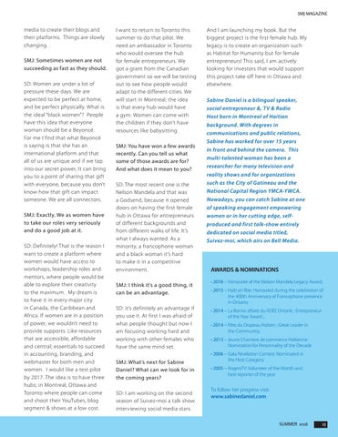 I want to return to Toronto this summer to do that pilot. We need an ambassador in Toronto who would oversee the hub for female entrepreneurs. We got a grant from the Canadian government so we will be testing out to see how people would adapt to the different cities. We will start in Montreal; the idea is that every hub would have a gym. Women can come with the children if they don’t have resources like babysitting. SMJ: You have won a few awards recently. Can you tell us what some of those awards are for? And what does it mean to you? SD: The most recent one is the Nelson Mandela and that was a Godsend, because it opened doors on having the first female hub in Ottawa for entrepreneurs of different backgrounds and from different walks of life. It’s what I always wanted. As a minority, a francophone woman and a black woman it’s hard to make it in a competitive environment. SMJ: I think it’s a good thing, it can be an advantage. SD: it’s definitely an advantage if you use it. At first I was afraid of what people thought but now I am focusing working hard and working with other females who have the same mind set. SMJ: What’s next for Sabine Daniel? What can we look for in the coming years? SD: I am working on the second season of Suivez-moi a talk show interviewing social media stars.