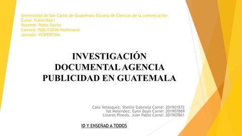 INVESTIGACIÓN DOCUMENTAL AGENCIA PUBLICIDAD EN GUATEMALA Catú Velásquez, Shellie Gabriela Carné: 201901872 Yat Melendez, Eymi Dayli Carné: 201907889 Linares Pineda, Juan Pablo Carné: 201907861