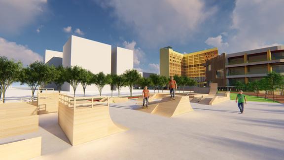 Pembagian zoning pada tapak dirancang dengan terpisah namun saling terhubung dengan akses jalan ke berbagai bangunan. Zoning tersebut dibagi sesuai dengan fungsi bangunan. Layout bangunan pada tapak dibuat mengelilingi taman yang berada di tengah tapak sebagai penguhubung antara bangunan serta dapat dijadikan sirkulasi udara sehingga udara sejuk dapat dirasakan pada tapak ini.