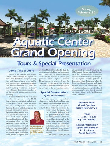 Join us as we tour the new Aquatic Center. Take a moment to explore the brand new shower and changing facility, then stroll by the relaxing Jacuzzi and the main recreation pool with its various amenities, including lap lanes, zero entry, and shallow and deep water areas. The therapy pool will feature demonstrations on how to use the adaptable water chair to access the pool ramp. by Dr. Bruce Becker Wellness staff members will be on hand Aquatic exercise can be a remarkably to talk with you about the Health Connections fitness schedule, including our effective tool for battling high blood prespopular water exercise classes, and intro- sure, obesity, insulin resistance, and other duce you to new Specialty Aquatic classes. chronic illnesses. Throughout the past 30 Personal Trainers will offer special, dis- years, Dr. Bruce Becker has researched the positive effects that aquatic exercounted introduction sessions cise can have on the human body. for those residents wanting more His presentation is filled with of a one-on-one approach to fact-finding evidence, the many their water fitness program. physical benefits, as well as the Program Coordinators will share positive effects on your brain, resinformation about poolside piratory system, and other intersocials and explain how you and nal organs. Learn how one can your court can use the new facil- Dr. Bruce Becker is help prevent, reverse, or control ity for your entertainment pleas- an internationally ure. The Rehab team will offer recognized expert in chronic disease through aquatic exercise. information about the rehabili- the field of aquatic Dr. Bruce E. Becker, MS, an tation benefits of aquatic ther- therapy.