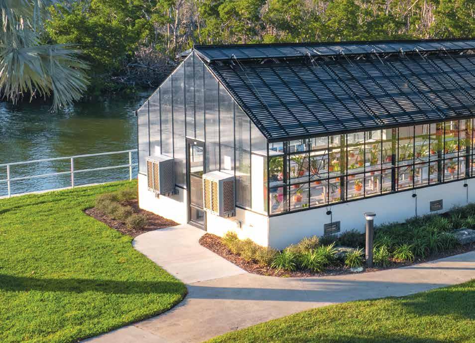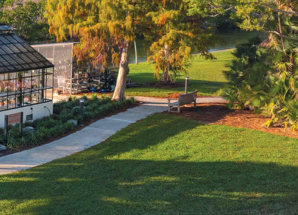 allowing for additional care and flexibility. When Hurricane Ian passed through Fort Myers that September, the Orchid House was damaged beyond repair, but the Shade House stood strong. Led by Vicki Waterstadt (Cellana), volunteers continued to tend orchids in the space.