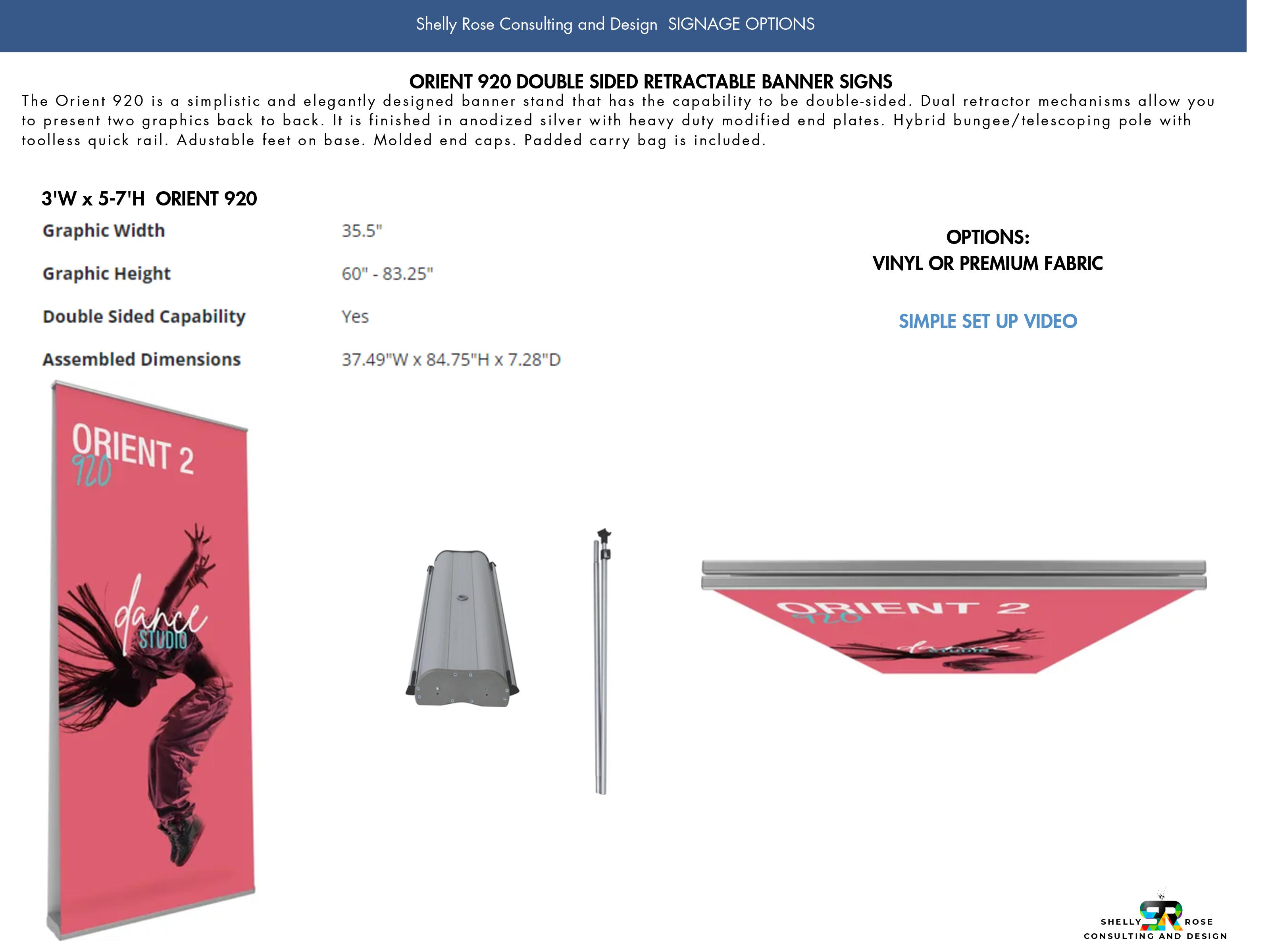 3'W x 5-7'H ORIENT 920 DOUBLE SIDED RETRACTABLE BANNER, Assembled Dimensions:35.5"W x 84.75"H x 7.28"D. Dual retractor mechanisms allow you to present two graphics back to back. It is finished in anodized silver with heavy duty modified end plates. Hybrid bungee/telescoping pole with toolless quick rail. Adustable feet on base. Molded end caps. Padded carry bag is included. Double Sided Vinyl Graphic Mural.