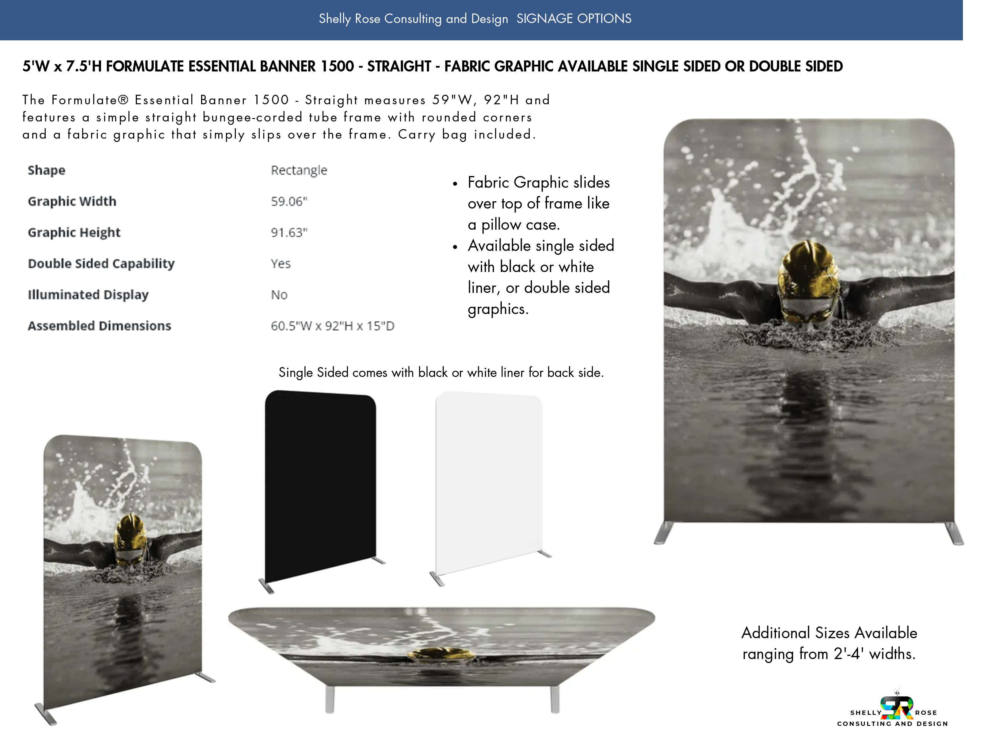 5'W x 7.5'H FORMULATE ESSENTIAL BANNER 1500, Assembled Dimensions: 60.5"W x 92"H x 15"D. Features a simple straight bungee-corded tube frame with rounded corners and a fabric graphic that simply slips over the frame. Carry bag included. Available Single or Double Sided Fabric.
