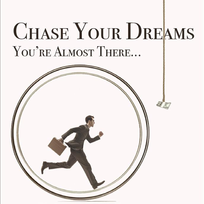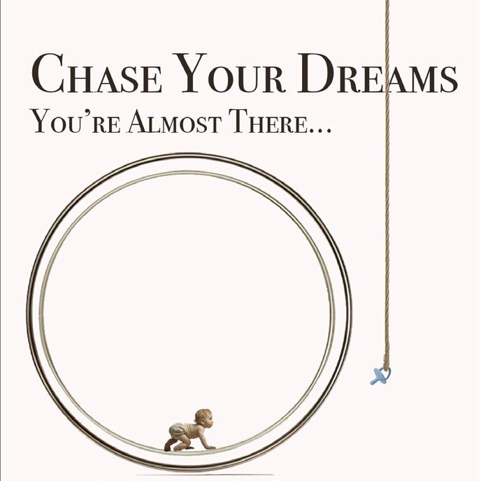 The famous symbol of a “carrot on the stick” and “hamster wheel” represent our never-ending chase for the next goal through the progression of age. In this version, instead of a “carrot”, different goals specific to the age are being chased: toddler to pacifier, student to graduation diploma, employee to paycheck raises, groom to marriage proposal, and elder to family portrait.The phrase “Chase Your Dreams; You’re Almost There...” gives the false impression of almost reaching a satisfactory end goal, when in reality, the race never stops.