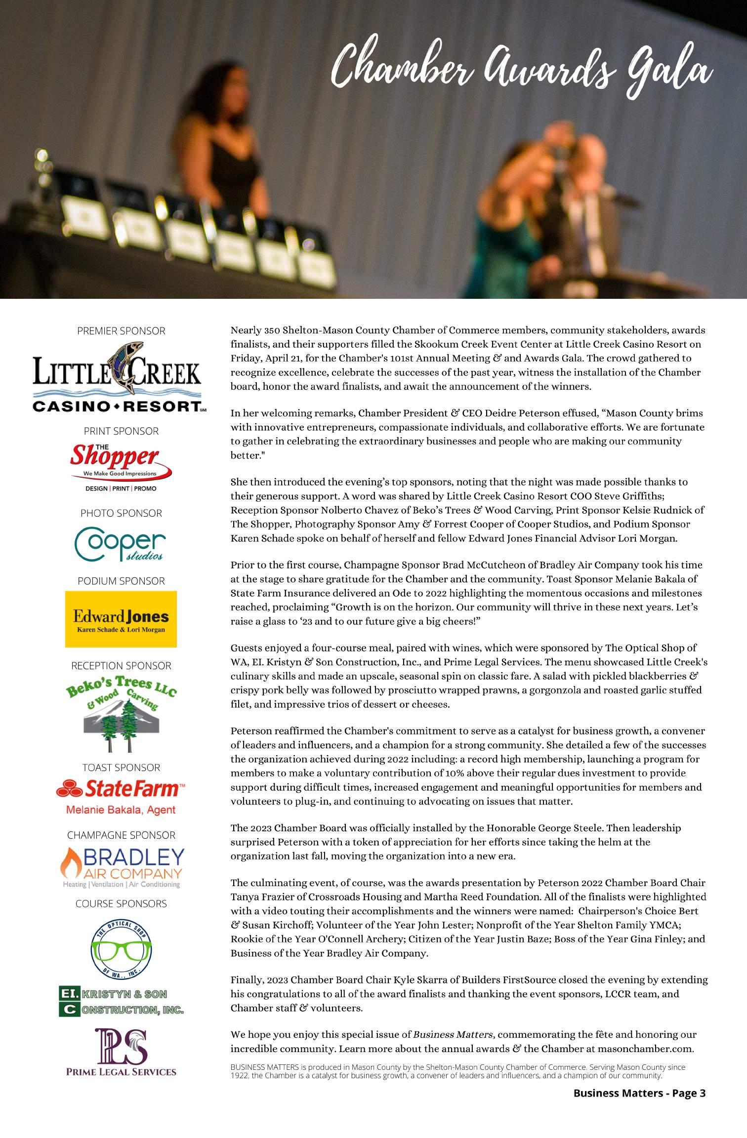 This commemorative issue of Business Matters provides a look back at the April 21, 2023 Chamber Awards Gala and features all the awards finalists and winners. Elected categories include Boss of the Year, Citizen of the Year, Nonprofit of the Year, Rookie of the Year, and Business of the Year. Chairperson's Choice and staff-selected Volunteer of the Year are also highlighted.