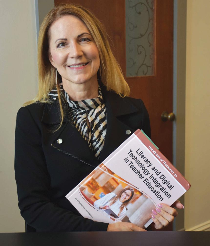 LEFT: Dr. Jennifer Penland is paving the way forward in adapting a hybrid of in-person and online teaching methods. Penland co-wrote the chapter “Perceptions of New Realities for the 21st Century Learner” with Dr. Kennard Laviers, assistant professor of computer science at Sul Ross State University in Texas, for the newly released Handbook of Research on Literacy and Digital Technology Integration in Teacher Education with IGI Global. The chapter explores the use of virtual and mixed realities in the classroom.These changes to the typical structure of the School of Education’s course work and student teaching field compo nent may seem like a sudden outcome forced by the pandemic. In reality, they merely reflect an accelerated timeline of embracing a more technological-heavy learning environment. Before COVID19, the education technology business was already nearing $19 billion glob ally; now, it is projected to reach $350 billion over the next five years.