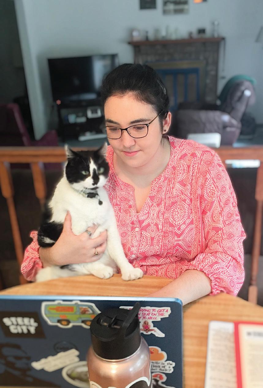 ABOVE: Claire Affinito ’20, pictured with cat Sebastian, created virtual lesson plans with her cooperating teacher at Shepherdstown Middle School during spring 2020. Claire, who was the recipient of several Shepherd University Foundation scholarships and named a McMurran Scholar during her time at Shepherd, was only at the middle school for five days before the COVID19 pandemic shut down the public school system.In March 2020, the world as we knew it came to a sudden and jarring halt as the COVID-19 pan demic began affecting communities nationwide, including our own. As a challenging and often frightening quarantine ensued, the Shepherd commu nity far and wide developed a unique sense of camarade rie born of a host of evolving emotions. Amid personal concerns for friends and family, we worried for the wellbeing of our students, mourned our desolate campus, and ached for our seniors whose final semester of college was irrevocably altered.
