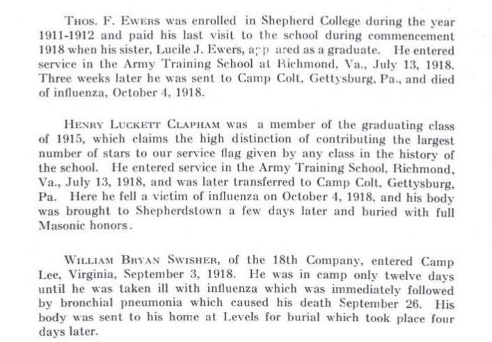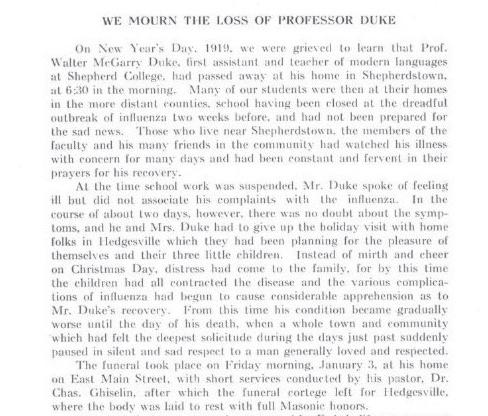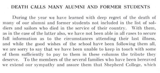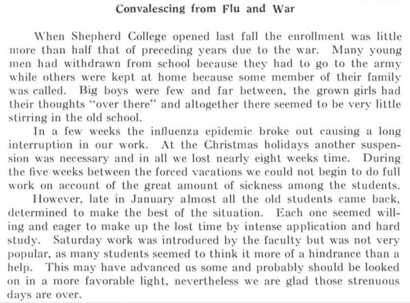 And yet our rich institutional history reminds us that we have faced similar hardship in the past. The Shepherd Uni versity Archives and Special Collections contains records detailing how the lives of students, faculty, and alumni were affected during the influenza epidemic of 1918-1919. Archived issues of The Picket and the Cohongoroota are peppered with glimpses into the lives of Shepherd students, faculty, and alumni from this time period, from class notes to editorials to memorials to the dead.