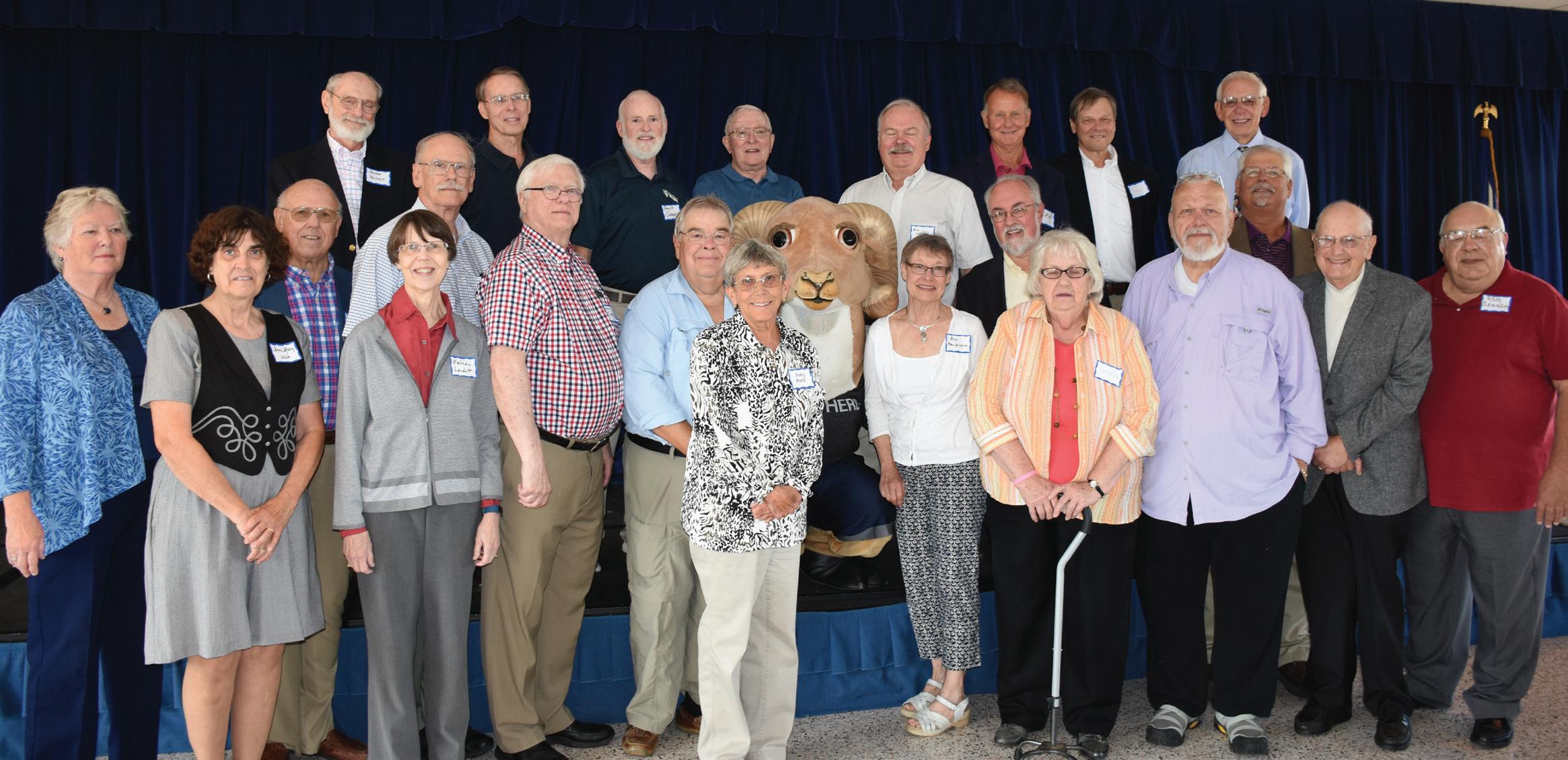 Above: Shepherd faculty and staff retirees returned to campus for the annual luncheon on October 6, 2017. Pictured above (l. to r.) are Dr. Charlotte Anderson, Anna Mary Walsh ’75, Dr. Mike Jacobs, Melinda Landolt ’75, Dr. John Landolt, Dr. Jerry Thomas, Dr. Doug Horner, Joan Pope ’74, Rambo, Ann Henriksson, Ken Harbaugh, Patt Welsh, Dr. Phil Simpson, Dave Cole, Charles Woodward ’59, and Dr. Rob Cleminson; back row, Haydon Rudolf, Dr. Rick Gibson, Gayle Conner ’75, Dr. John Winters, Dr. Anders Henriksson, Dr. Dan Starliper ’69, Dr. John “Quincy” Adams ’71 and ’73, and Ed Fincham.