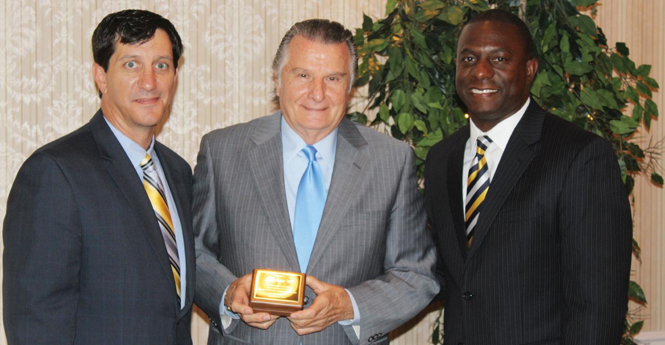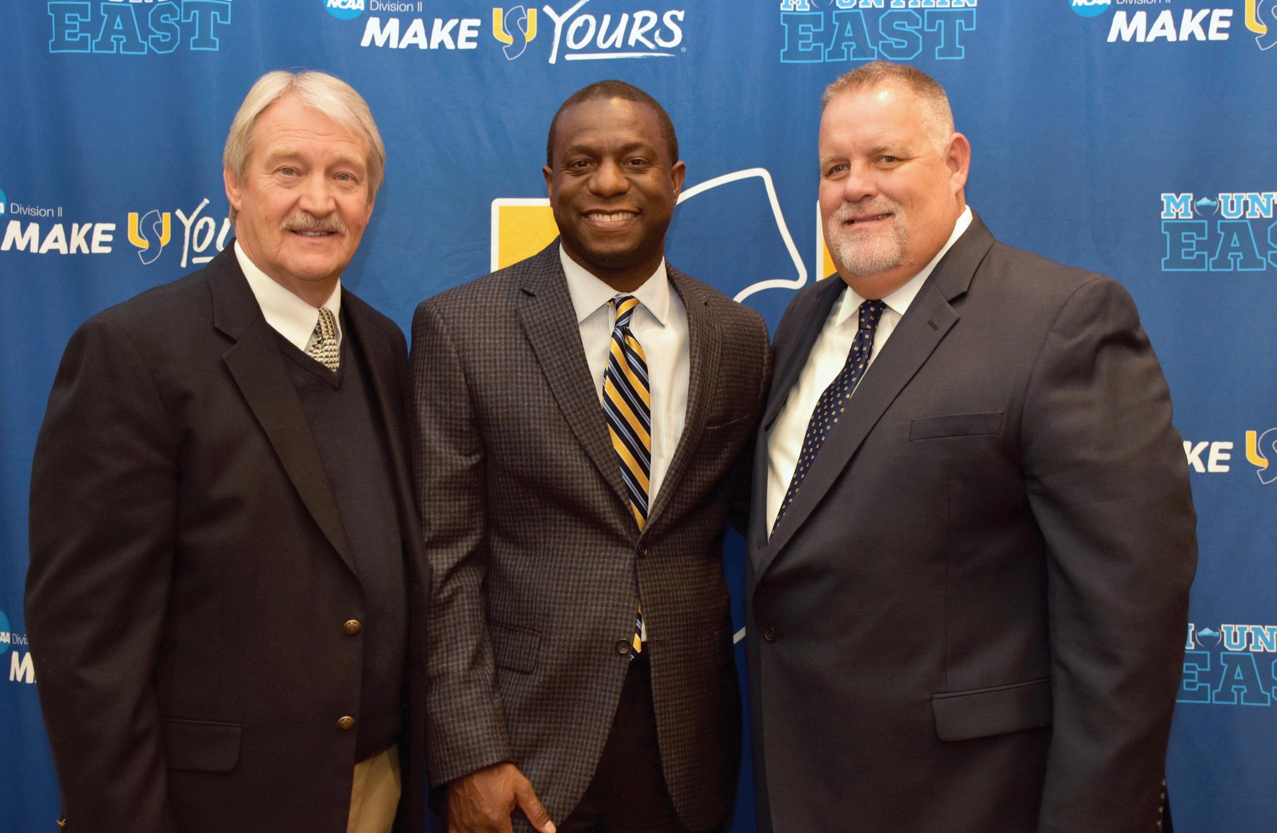 Football Head Coach Monte Cater announced his retirement during a January press conference. Pictured above (l. to r.) are Coach Cater, Chauncey Winbush ’95 and ’00, vice president for athletics, and Ernie McCook, who will take over head coach duties at Shepherd University.