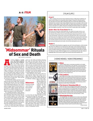 *557!3&0!3')#!.6:)-$!%.01#$7$-'&2!7'.)5+)'(*! )#$! ,'.6&-.! '()5! *557! )+'%.W&(7! :&78!9--! 54! ?$--$C.!,'--&*$+.!&+$!*&+:$7!'(!3#')$!&(7!/&(0! favor wreaths of flowers and greenery. Every3#$+$!&+$!+6('1!'(.1+'%)'5(.!&(7!/5+$!54!)#&)! 45-B!&+)X!$-&:5+&)$!.$).!54!*$.)6+$!&(7!/$-570! are significant to the village cultists, but baffling to the little band of outsiders. There are /&0%5-$.!&(7!1'+1-$!7&(1$.2!Y6&'()!'4!')!3&.(C)! &--!.-'*#)-0!3$'+72!-'B$!)#$!Z5-'7&0!>5-B!>&'+! &.!1#5+$5*+&%#$7!:0!<&,'7![0(1#8 K5/$! 7'.16..'5(! 5116+.! /'73&0! &:56)! 16-A )6+&-! +$-&)','./8! E5.)! 54! )#$! ,'.')5+.! &+$! &%A %&--$7! 3#$(! )35! $-7$+-0! ,'--&*$+.! -$&%! 4+5/! &! precipice to the rocks below and are finished off :0! 1$-$:+&().! 3'$-7'(*! &! *'&()! 3557$(! /&--$)8! V#&)C.! 35+.$! &:56)! )#&)!)#&(!$(7'(*!056+! -'4$!'(!&!#5.%'1$!3')#! Midsommar &!)6:$!6%!056+!(5.$\! Florence Pugh G#+'.)'&(! &(7! H5.#! Jack Reynor =V'--'&/! H&1B.5(! Z&+%$+@2!:5)#!&()#+5A Directed by %5-5*0! .)67$().2! :$A Ari Aster *'(! 15/%$)'(*! 5,$+! Rated R 3+')'(*! )#$'+! )#$.$.! 5(! )#$! ,'--&*$8! M6)! !"#$%&&()*'.!:'--$7! as a horror film and village life looks more and /5+$!.'('.)$+!)#$!-5(*$+!)#$!,'.')5+.!-'(*$+8 !"#$%&&()*'(1-67$.!/&(0!/5/$().!54!*5+$2! .5/$!54!')!&%%&--'(*-0!'/&*'(&)',$2!&(7!-5).!54! *+&%#'1!%+51+$&)',$!.$]!46$-$7!:0!/'(7A&-)$+'(*! %5)'5(.!&(7!+#0)#/'1!7+6//'(*2!1#&(*'(*!&(7! 7&(1$8!9.)$+!#&.!1+$&)$7!&!.$-4A15()&'($7!35+-7! that reflects badly on the fantasy of Edenic pri/$,&-! .51'$)'$.2! :6)! &-.5! %&'().! &! %+$))0! *-6/! %'1)6+$!54!15()$/%5+&+0!.51'$)08