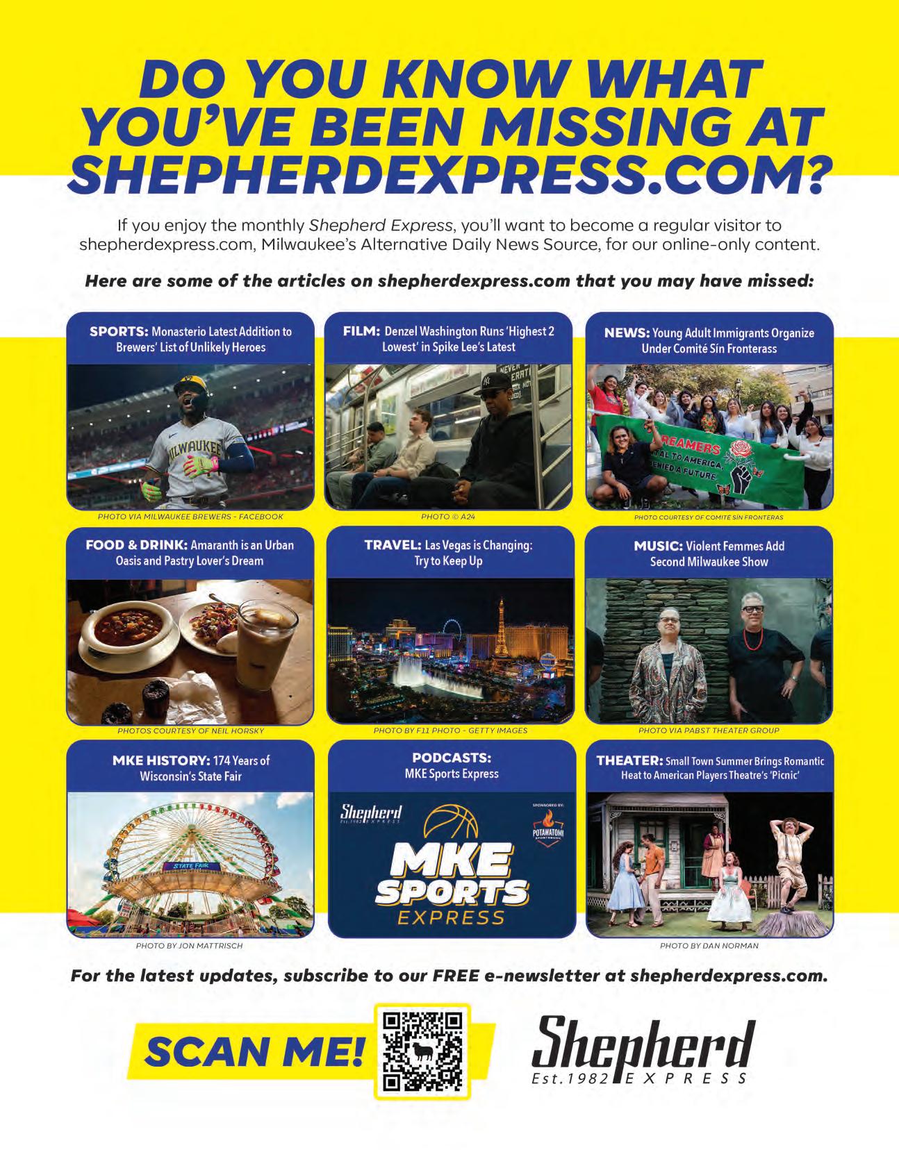Advertising Inquiries: jackie@shepex.com e-mail: info@shepex.com URL: shepherdexpress.com