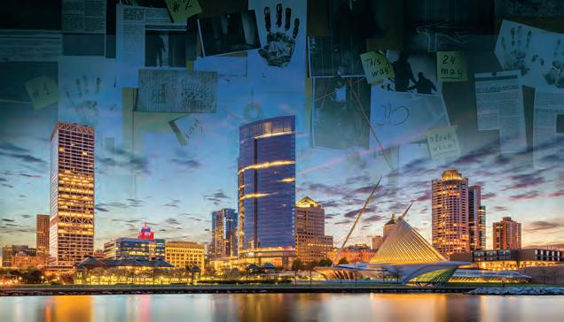 Photo of Milwaukee skyline by GettyImages/Sean Pavone. Photo of evidence board by