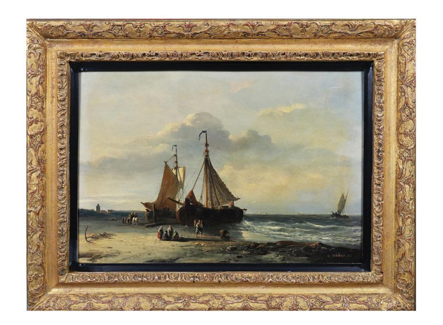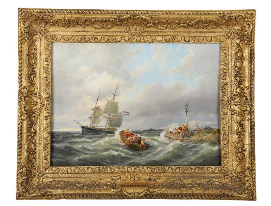A finely detailed marine composition depicting a sailing vessel and figures in small boats navigating lively waters under a broken sky. Oil on panel, signed lower left. Presented in an elaborate gilt frame.