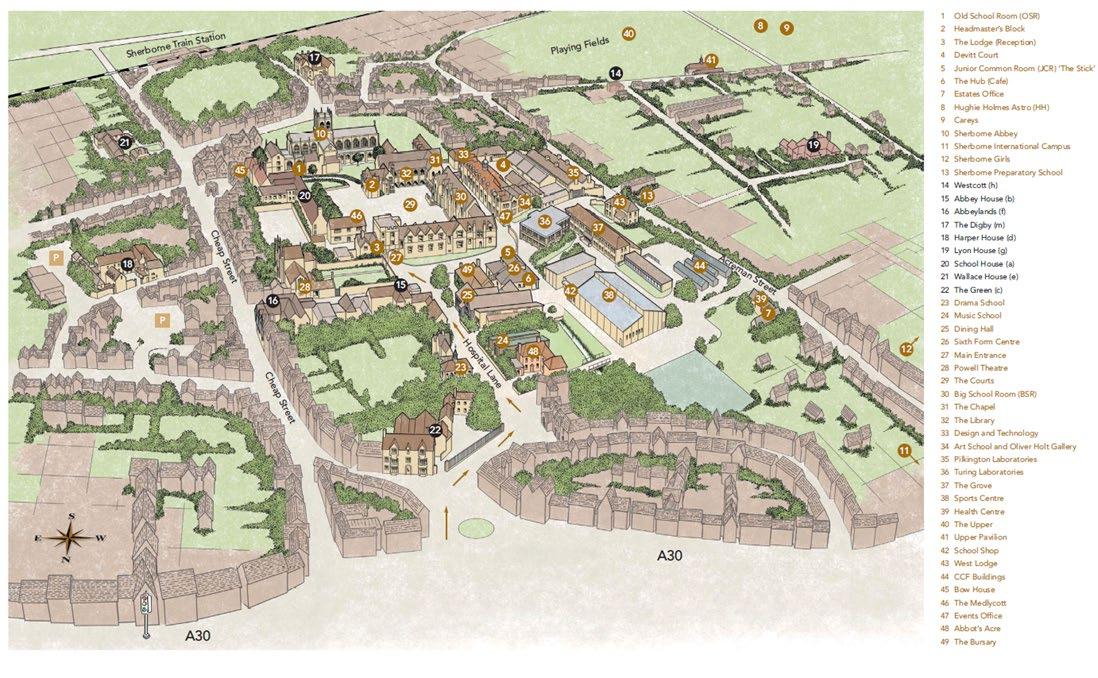 The San (Health Centre) School medical centre, with full time nurses and visiting doctors a School House b Abbey House c The Green d Harper House