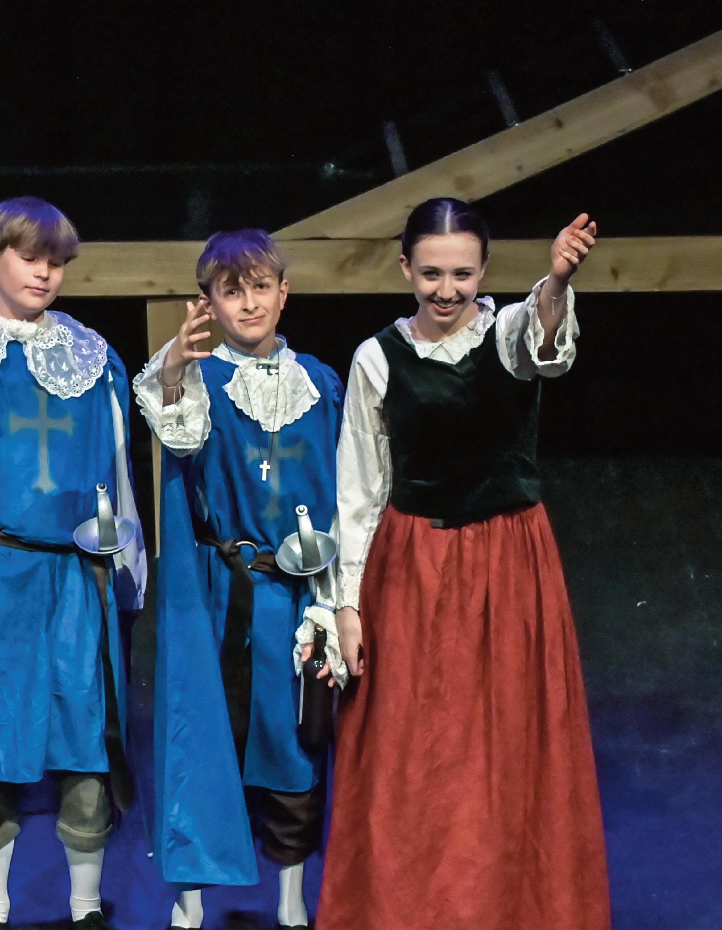 cast as Richelieu - his voice suited the role of the mighty Cardinal D’Artagnan had much to do on stage! Apart from having a lot of lines to learn, he (Anton Krnc (3a)), like Constance, had to evolve over the course of the play: initially ready to pick a fight almost literally at the drop of the hat (because his father (James Holden (4g)) had told him not to let anyone get the better of him), he became increasingly mature, ready to help defend his Queen’s honour I did not instantly recognise Olly Macdonald (4a) in his garb of the Musketeers’ leader, Treville; he certainly was good at keeping his troops in order! All others please accept my apologies for not mentioning everyone individually - I genuinely enjoyed how each of you played I