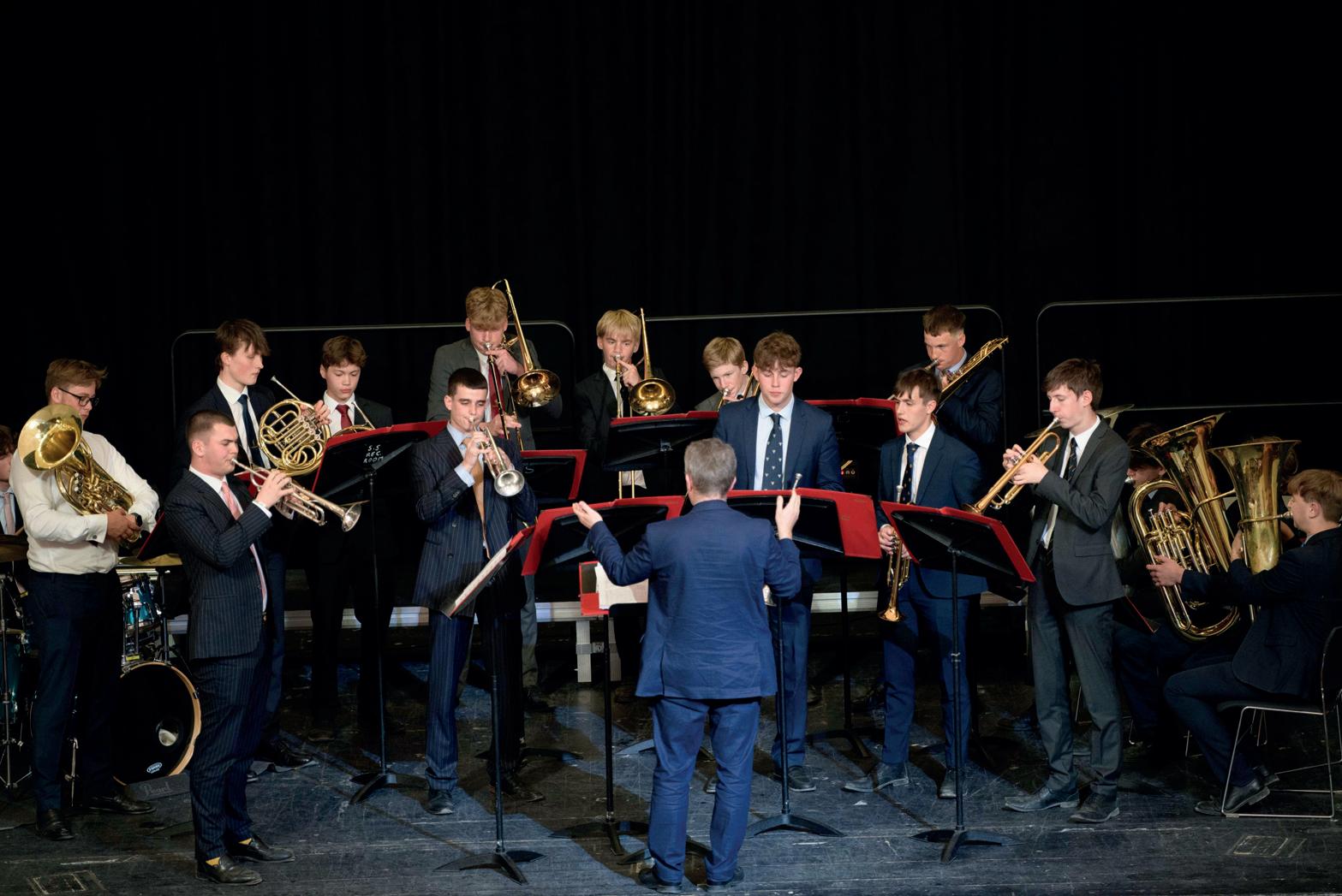 The Swing Band, with vocalists Orlando Tavener Sch.Mus (U6b) and James Coleman Sch.Mus (U6a) and whose membership is listed on the Gala Concert programme, was on an undoubted high this year with a trumpet section (Henry Cannon Sch.Mus (U6c), Charlie Burtt Sch.Mus (U6c), Archie Beardsell (U6f) and Archie Gibbons (5f)) that was quite exceptional. A similarly strong trumpet section a decade ago became professional musicians with two of them returning for the gala concert.