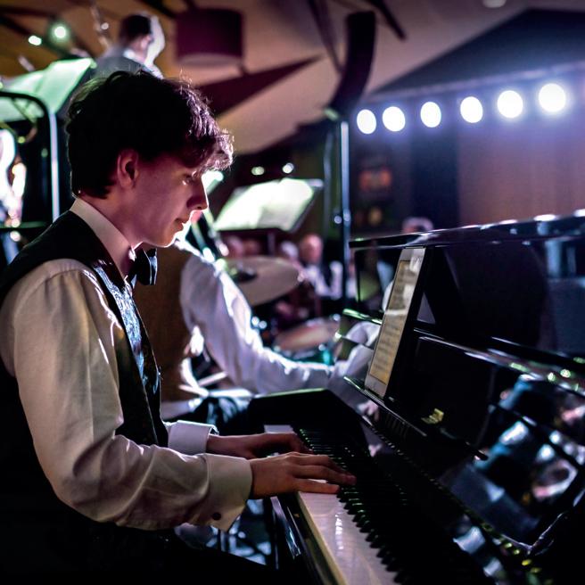 invitation, was enlarged in performing number with the inclusion of nearly fifty Old Shirburnian musicians—many of them of now professional—either playing, singing, or sitting in the audience. A highlight of the evening was the Radio Orchestra’s performance of New York, New York (the lush strings of the Concert Orchestra combining with the orchestral woodwind section and the Swing Band saxophones, brass and rhythm section) with returning Old Shirburnian professional singer Robert Folkes (a 12), whilst the extraordinarily rich