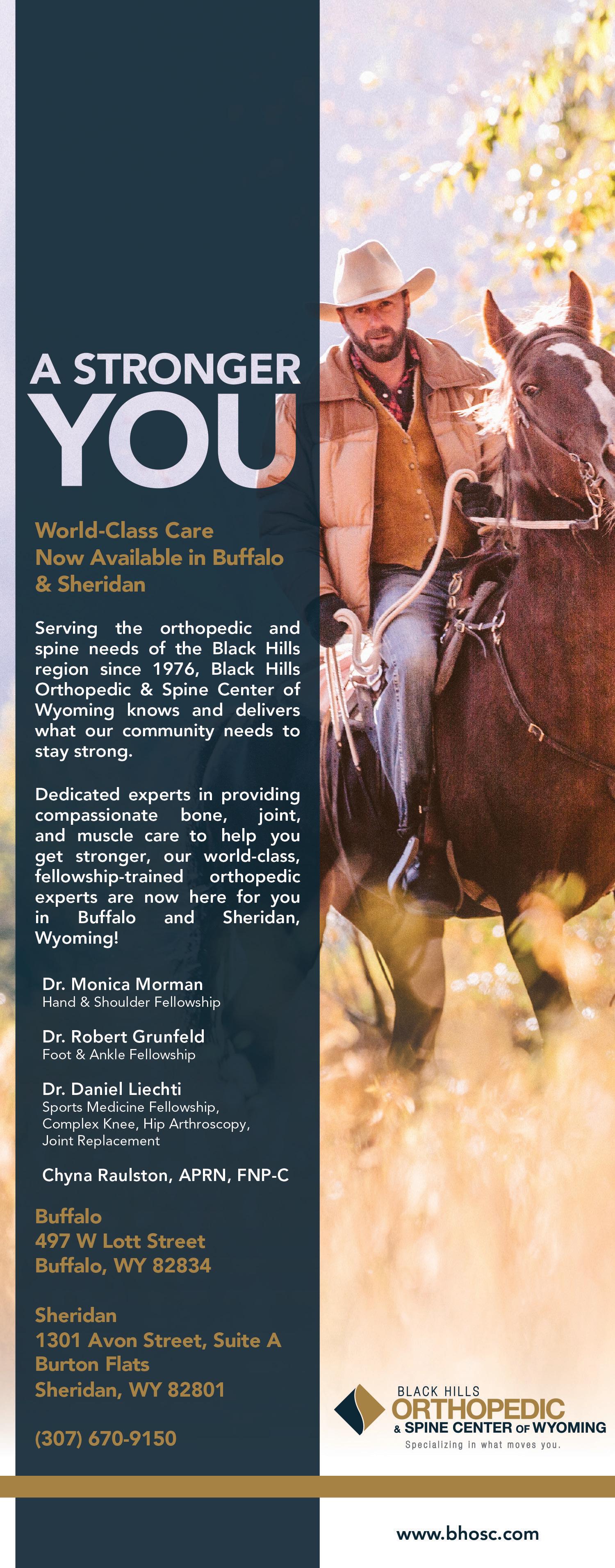 Country Bounty, January 17, 2023, page 5 A STRONGER YOU World-Class Care Now Available in Buffalo & Sheridan Serving the orthopedic and spine needs of the Black Hills region since 1976, Black Hills Orthopedic & Spine Center of Wyoming knows and delivers what our community needs to stay strong. Dr. Monica Morman Hand & Shoulder Fellowship Dr. Robert Grunfeld Foot & Ankle Fellowship Dr. Daniel Liechti Sports Medicine Fellowship, Complex Knee, Hip Arthroscopy, Joint Replacement Dedicated experts in providing compassionate bone, joint, and muscle care to help you get stronger, our world-class, fellowship-trained orthopedic experts are now here for you in Buffalo and Sheridan, Wyoming! Chyna Raulston, APRN, FNP-C Buffalo 497 W Lott Street Buffalo, WY 82834 Sheridan 1301 Avon Street, Suite A, Burton Flats Sheridan, WY 82801 www.bhosc.com (307) 670-9150 Inside Tangles at 32 S. Main Street Book Appointments online or by phone Aestheticawy.com • (603) 499-1564 • Specialized Facials • Face and Body Waxing • Lash and Brow Tinting NEW ARRIVAL! 2021 Ford F-250 Crew Cab XL, 6.2/Auto, All Power Options, FX4 Pkg, 4WD, 18K Miles, WARRANTY! $56,995 LET’S DEAL! PRIME RATE MOTORS 307-674-6677 2305 Coffeen, Sheridan primeratemotors.com