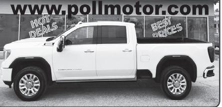 Country Bounty, August 15, 2023, page 5 Read the Country Bounty online at www.countrybounty.com VISIT US AT THIRDSHERIDAN’STHURSDAY FESTIVAL 203 4X4S POLL MOTOR 307-655-5542 1812 Coffeen Avenue, Sheridan pollmotor.com 2022 CHEVY SILVERADO 1500 LIMITED RST 5.3L, Heated Cloth, Z71, 9K Miles, 4WD. $53,995 POLL MOTOR 307-655-5542 1812 Coffeen Avenue, Sheridan pollmotor.com 2022 GMC SIERRA 2500HD DENALI D uramax, Power Boards, Sunroof, 39K Miles, 4WD, 6.6L. $77,995 POLL MOTOR 307-655-5542 1812 Coffeen Avenue, Sheridan pollmotor.com 2019 HONDA RIDGELINE RTL L eather, Sunroof, Tow Pkg, Local trade, 52K Miles, AWD. $31,995 POLL MOTOR 307-655-5542 1812 Coffeen Avenue, Sheridan pollmotor.com 2016 GMC CANYON SLE AllTerrain, Leather, Local Trade, Remote Start, 78K Miles, 4WD. $28,995 POLL MOTOR 307-655-5542 1812 Coffeen Avenue, Sheridan pollmotor.com 2021 TOYOTA TACOMA TRD OFF-ROAD Tow Pkg, Keyless Entry, Longer Box, 26K Miles, 4WD. $42,995 POLL MOTOR 307-655-5542 1812 Coffeen Avenue, Sheridan pollmotor.com 2022 CHEVY SILVERADO 2500HD LT Duramax, Heated Seats, Remote Start, 11K Miles, 4WD, 6.6L, $68,995
