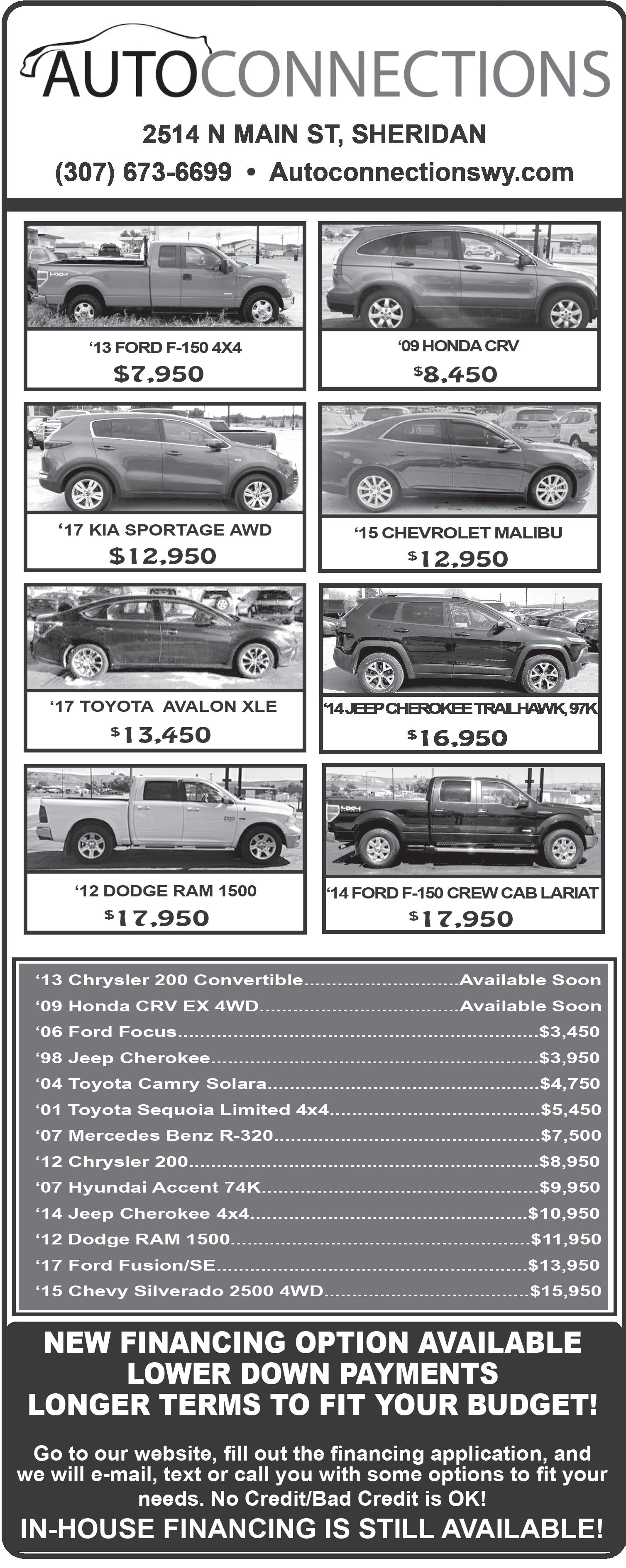 Country Bounty, August 22, 2023, page 28 AFFORDABLEAUTOSWY.COM • AFFORDABLEAUTOSWY.COM • AFFORDABLEAUTOSWY.COM • AFFORDABLEAUTOSWY.COM • AFFORDABLEAUTOSWY.COM • AFFORDABLEAUTOSWY.COM • AFFORDABLEAUTOSWY.COM • AFFORDABLEAUTOSWY.COM • AFFORDABLEAUTOSWY.COM • AFFORDABLEAUTOSWY.COM • • AFFORDABLEAUTOSWY.COM • AFFORDABLEAUTOSWY.COM • AFFORDABLEAUTOSWY.COM • AFFORDABLEAUTOSWY.COM • AFFORDABLEAUTOSWY.COM • Online @ AFFORDABLEAUTOSWY.COM Wholesale to the public means Newer cars for less. Never any added charges or fees. SO WHY PAY MORE FOR LESS? 2350 COFFEEN AVENUE, SHERIDAN Call 673-8277 or Peter’s cell 752-6154! Hours: M-F 9:00-5:00 and Saturday 10:00-2:00 AFF RDABLE AUT S `18 VOLKSWAGEN ATLAS AWD Really Nice, 3-Row & Efficient! $19,000 22-24 MPG! `21 TOYOTA COROLLA Fun Toy, Save for Decades! $18,000 35-38 MPG! `17 NISSAN MURANO SV AWD Totally Loaded Up, Fun, Sporty V6! $16,000 2-Owner! `18 HONDA CIVIC EX 64 K Miles, Sharp and Always Fun! $15,000 30-40 MPG! `16 CHEVY SILVERADO CREW 4X4 Nice, Clean, for Work or Play! $14,500 1-Owner! `15 FORD EDGE AWD Sweet, Maintained, Loaded up 3.5 V6! $14,000 24 MPG! `02 FORD F-250 SUPER 4X4 Awesome 7.3 Powerstroke Diesel! $12,500 Let’s Go! `16 FORD EXPEDITION EL 4X4 3.5 EcoBoost,We’ve Driven a Lot! $12,000 2-Owner! `16 FORD FUSION AWD Sporty, Fun, All-Wheel-Drive! $12,000 2-Owner! `15 JEEP PATRIOT SPORT Really Sharp, Red, Ready 6-speed! $9,000 87K Miles! `19 CHEVY TRAX LT AWD Save for Years, Fun, Economical SUV! $11,000 61K Miles! `09 GMC SIERRA CREW 4X4 Nice, Clean, Local, Ready Now! $10,500 1-Owner! `11 HONDA CR-V EX 4WD Always Dependable, Sporty & Efficient! $10,000 22-24 MPG! `07 TOYOTA FJ CRUISER 4X4 You’ve Got to Check This Out! $9,500 2-Owner! `10 HONDA CR-V 4WD Nice, Clean, Maintained Ride! $9,000 2-Owner! `05 FORD F-250 CREW 4X4 Bullet Proof, Nice Lariat! $8,500 Diesel! `13 FORD FLEX SEL AWD Totally Loaded up, 3-Row Seating! $8,000 `15 SUBARU LEGACY AWD Go Anywhere, All-Wheel-Drive! $7,500 1-Owner! `07 CHEVY SUBURBAN 4X4 Ready for Everyone this Winter! $7,000 `08 TOYOTA HIGHLANDER 4WD Clean, Sport 3-Row Toy, Let’s Go! $6,000 2-Owner! 2-Owner! 2-Owner! `15 JEEP GRAND CHEROKEE 4X4 Ready for Any Kind of Weather! $14,000 2-Owner! `19 FORD FUSION HYBRID Really a Nice, Maintained Ride! $13,500 38-41 MPG! `17 FORD TRANSIT CARGO Nice, Clean, Set up with Shelves! $13,000 1-Owner! `18 CHEVY SUBURBAN 4X4 New Shoes and Ready for Everyone! $12,000 1-Owner! `17 CHEVY MALIBU LT 53K Miles, Ready for the Road! $12,000 30-36 MPG! `15 CHEVY TRAVERSE LT AWD One of the Cleanest Local Rides! $13,000 1-Owner! `16 HONDA CIVIC EX You’ll Love this Sporty Fuel Miser! $12,500 31-42 MPG! `15 CHEVY 2500HD CREW 4X4 Work or Play, Check This Out! $12,000 1-Owner! `13 CADILLAC ESCALADE ESV AWD 6.2 V8, Big, Beautiful Blue, Let’s Go! $11,500 Platinum! Gibson Family Sales Team