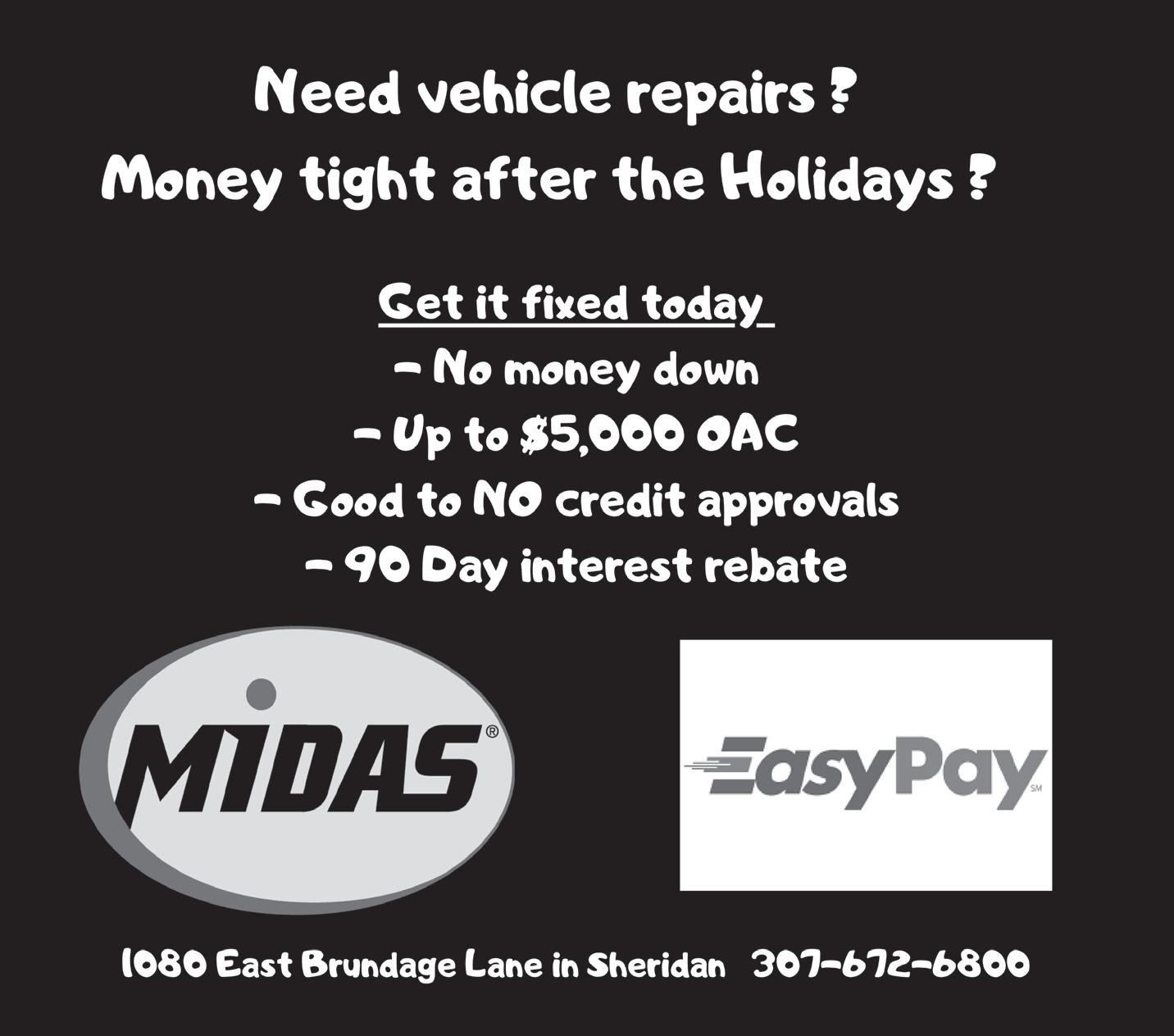 204 SUV FOR SALE BY OWNER - 2002 FORD EXPLORER , Eddie Bauer Edition. Body in great shape. New tires. Does have engine problem. Call 307-7522367.(29)119440 2014 RAV4 TOYOTA LIMITED, loaded, new tires, very clean, asking $15,000 OBO. Call 307-461-0232 or 307-4610175. (30)88107c CLEAN INSIDE & OUT! 2013 Chevy Equinox AWD LS, Champagne Silver, Black interior, 29 mpg highway, new tires, uses no oil $12,000. Call 520-241-1237.(29)07644d Advanced Auto Body 45 W. 9th St., Sheridan | 307-672-3333 AdvancedAutoBodyLLC.com DING? DENT? We Do One Thing. And We Do It Right! When you need superior auto body repair, call us first for expert service and affordable rates! Free Estimate. Free Pickup & Delivery. Complete Body Work. Open House Thursday, August 24th • 10am - 2pm 625 E. 5th Street, Suite 106 - Sheridan Evolve Physical Therapy by Gabbie Wendtland, Physical Therapist and Unto Health Care by Michelle Parker, Nurse Practitioner will be available to answer any questions and further explain the services they offer. 307-752-4281 • evolveptwyo.com • untohealth.com IS YOUR CAR AC Keep you & your car cool this summer. Take it to Midas for inspection and repair on ALL TYPES OF A/C SYSTEMS! 1080 E. Brundage Lane, Sheridan 307-461-4462 Tire & Auto Open: Mon-Fri 8-5:30 • Sat 9-3 2305 Coffeen Avenue 674-6677 • www.primeratemotors.com PRIME RATE MOTORS PRIME RATE WILL BUY, TRADE OR CONSIGN YOUR USED VEHICLES, TRAILERS, 4-WHEELERS, TRACTORS, ETC. PAYMENTS TOO HIGH... WE’LL DOWNTRADE Stop in or Call for a Certified Appraisal..Mon-Fri 8 am-5 pm CASH FOR CARS Buy - Trade - Consign LOW MILES! $AVE THOUSANDS!! 2018 Ram3500 Crew Cab Laramie, 6.7L Cummins/Auto, Navigation, Htd/Cooling Leather, Sat radio, 33K Lower Miles, 4WD, LOCAL TRADE!. $59,995 LET’S DEAL! PRIME RATE MOTORS 307-674-6677 2305 Coffeen, Sheridan primeratemotors.com POLL MOTOR 307-655-5542 1812 Coffeen Avenue, Sheridan pollmotor.com 2023 GMC YUKON XL AT4, 6.2L, Buckets, Panoroof, Tech Pkg, Power Boards, 1,186 Miles, 4WD $87,995 POLL MOTOR 307-655-5542 1812 Coffeen Avenue, Sheridan pollmotor.com 2022 JEEP COMPASS TRAILHAWK, Elite Group, Factory Warranty, 4WD, 3,863 Miles, $35,995!