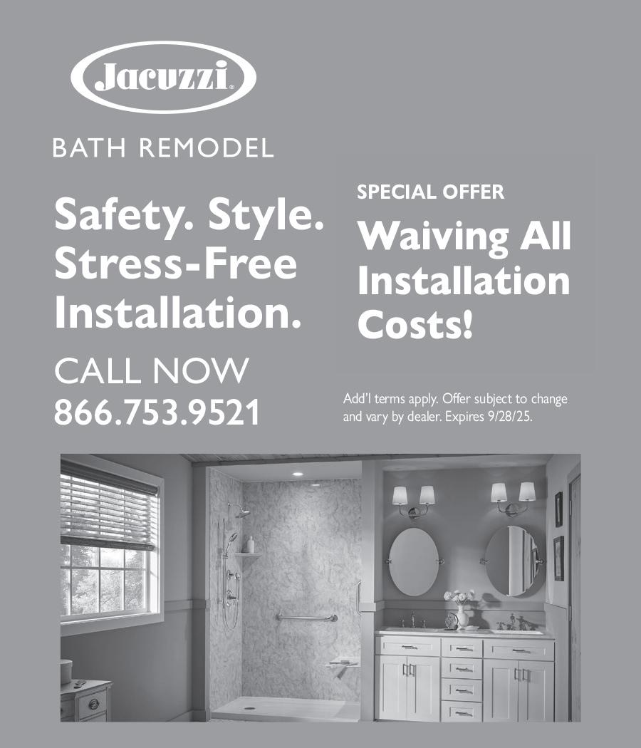 JACUZZI BATH REMODEL can install a new, custom bath or shower in as little as one day. For a limited time, waving ALL installation costs! (Additional terms apply. Subject to change and vary by dealer. Offer ends 6/30/25.) 1-844-501-3208