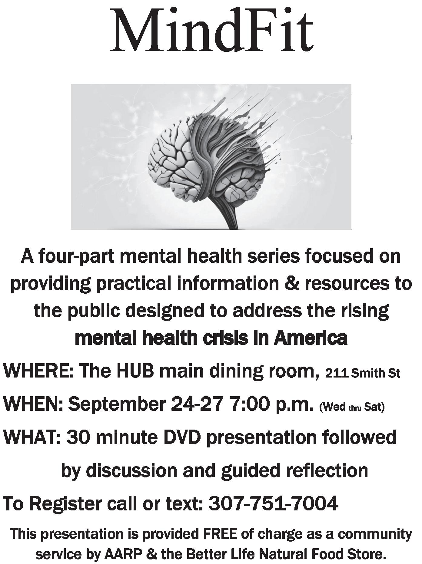 30: COPE - “COUNSELING IN OVERCOMING PAINFUL EMOTIONS”: 1PM, 130 W Montana St , Sheridan A nine-week program designed to help deal with the loss of a loved one and gain support from others in the community experiencing similar types of grief�