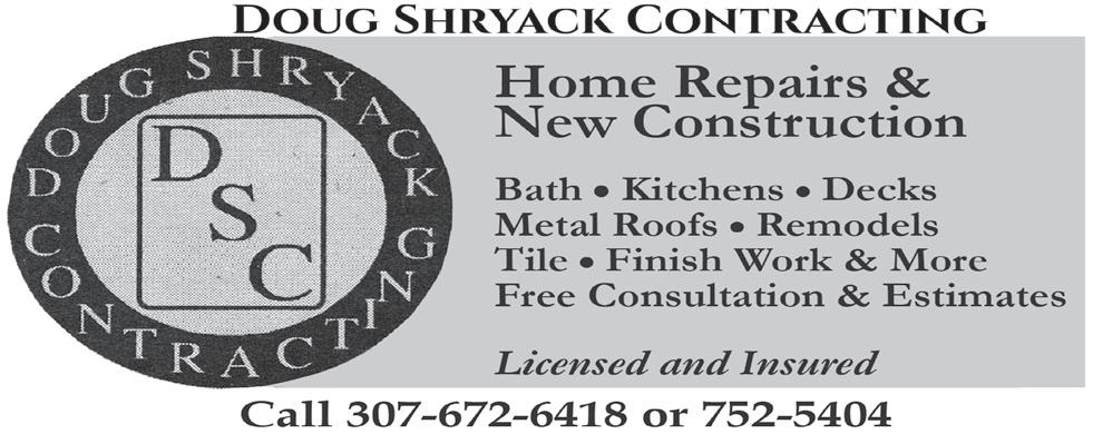 CBURTON CONCRETE, LLC 307-752-4234 C-us for all your Concrete Needs & Landscaping Curbing cburtonconcrete@gmail.com Chester Burton Sheridan, Johnson & Campbell Counties CONSTRUCTION Licensed Bonded Insured No Job to small 30 years experiance WYO-MAN REMODELING & Construction 763-3893 Brad Sprague Kitchens Bathrooms Flooring Windows & Doors Painting Inside & Out