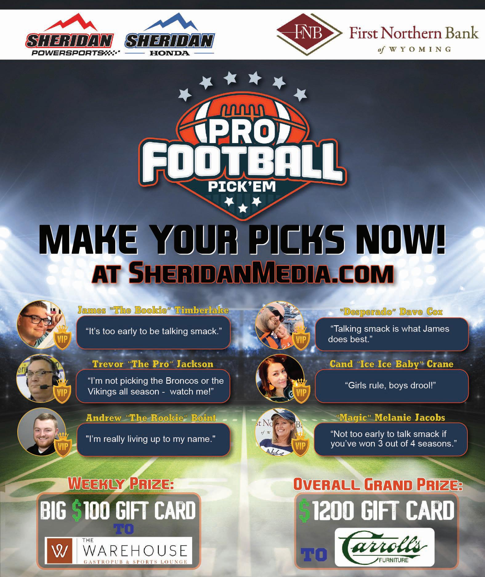 Full Service Truck Repair • Authorized CAT and Cummins dealer 124 Canfield, Sheridan WY Open: Monday-Friday 8am-5pm PHONE 674-8474 SHS FOOTBALL Date Opponent Time Location 9/29 @ East 6:00 pm Cheyenne 10/6 vs Kelly Walsh 6:00 pm Sheridan 10/13 vs Natrona 6:00 pm Sheridan 10/20 @ Campbell County 6:00 pm Gillette WYOMING COWBOYS Date Opponent Time Location 9/30 New Mexico Lobos 2:00PM Laramie 10/7 Fresno State Bulldogs 11:00AM Laramie 10/14 Air Force Falcons 5:00PM U.S. Air Force 10/28 Boise State Broncos 11:00AM Boise, ID COLORADO ROCKIES BASEBALL Date Opponent Time Location — — 9/26, vs. L.A. Dodgers 3:10 pm Coors Field 9/26 vs L.A. Dodgers 8:40 pm Coors Field 9/27 vs L.A. Dodgers 8:40 pm Coors Field 9/28 vs L.A. Dodgers 8:40 pm Coors Field A PLUS PLUMBERS BANK OF SHERIDAN CAMPCO FEDERAL CREDIT UNION CANDLEWOOD SUITES CHAPMAN, VALDEZ & LANSING EBIA HEARING
