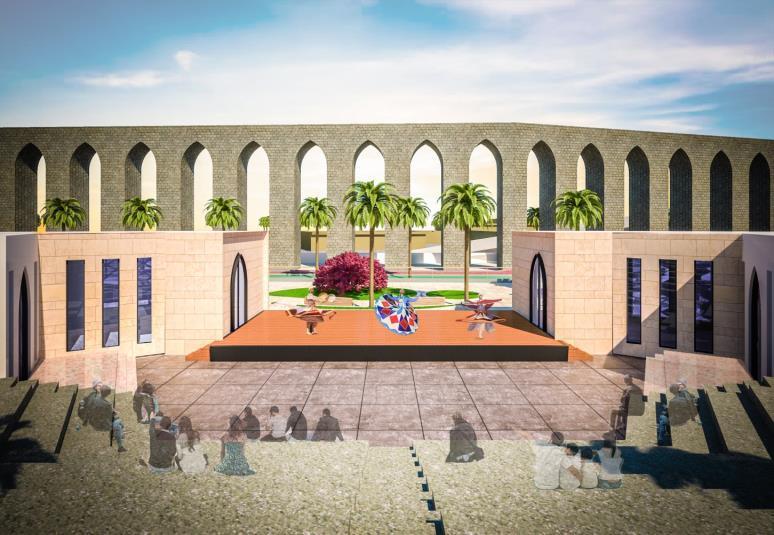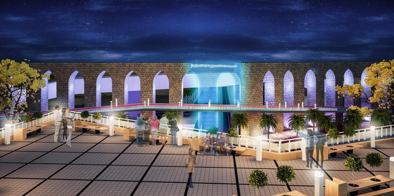 GRADUATION PROJECT(Revivalism of sour magra al-oyon zone (MagraAlOyoun Cultural Node) Night shoots show the aqueduct and the entertainment area behind it Hologram show on the aqueduct
