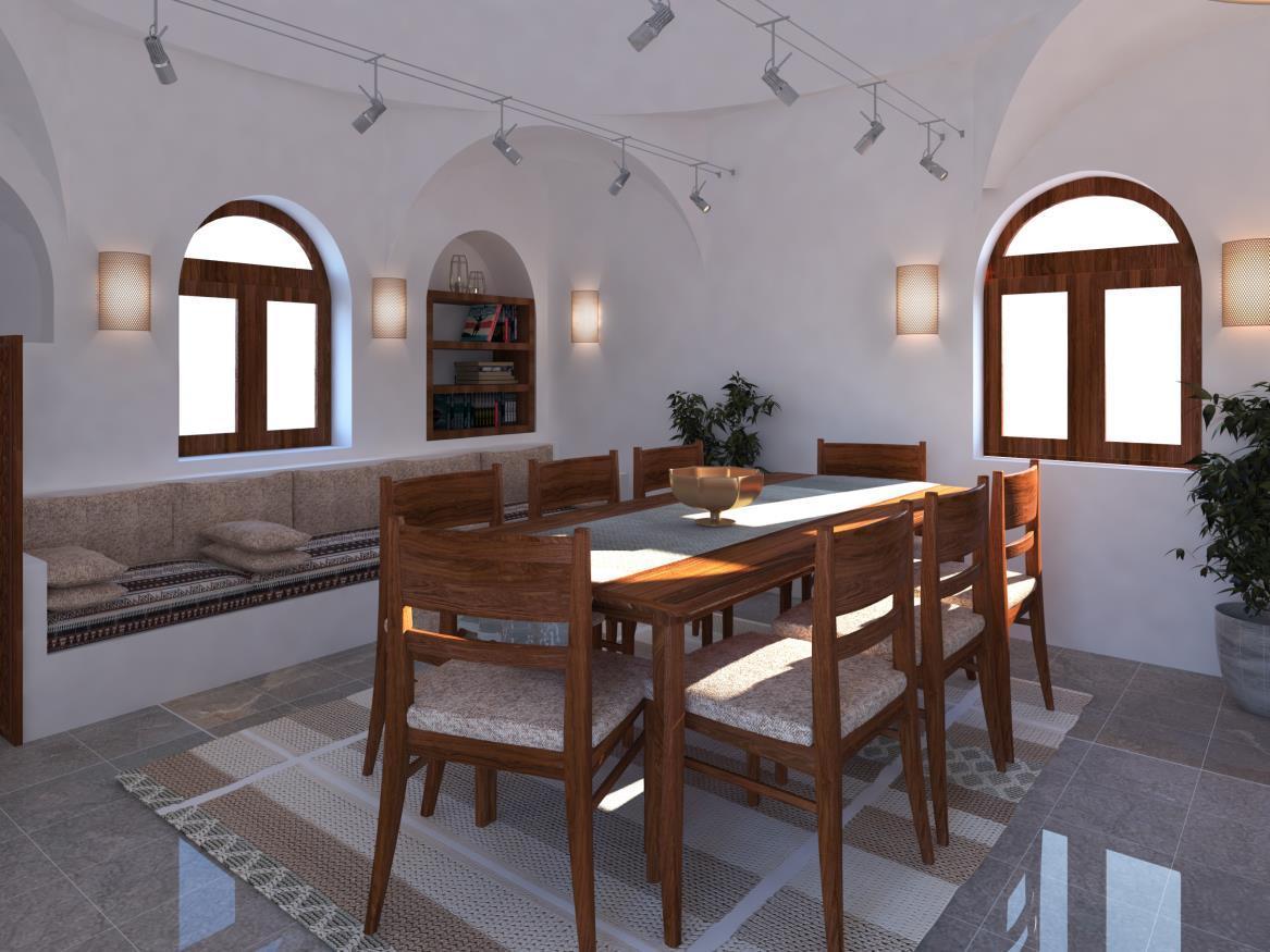 Restoration of Dining room with keeping the structure of windows , doors and the dome and choose a mood board suitable for the style of the place and its theme.
