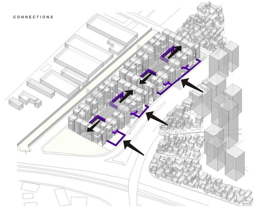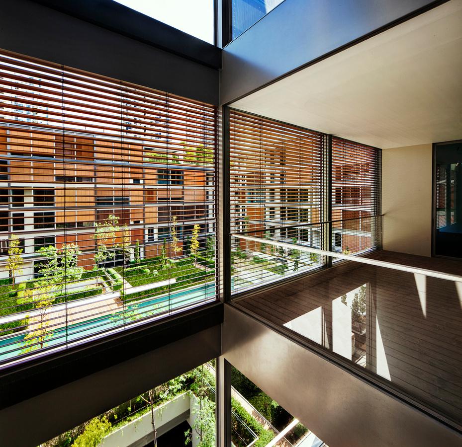 Titik akses tingkat yang berbeda memungkinkan konstruksi setinggi delapan tingkat tanpa memerlukan elevator. Titik akses tersebut sesuai dengan ruang rekreasi tertutup dari