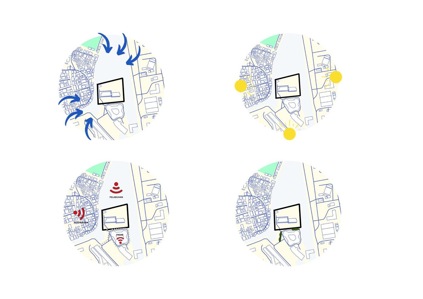 Opportunities, Lahan ini memiliki peluang dari konteks bangunan sekitar seperti cagar budaya, pasar, maupun pelabuhannya jika terus dipertahankan dan dikembangkan sehingga menjadi sebuah daerah yang aktif.
