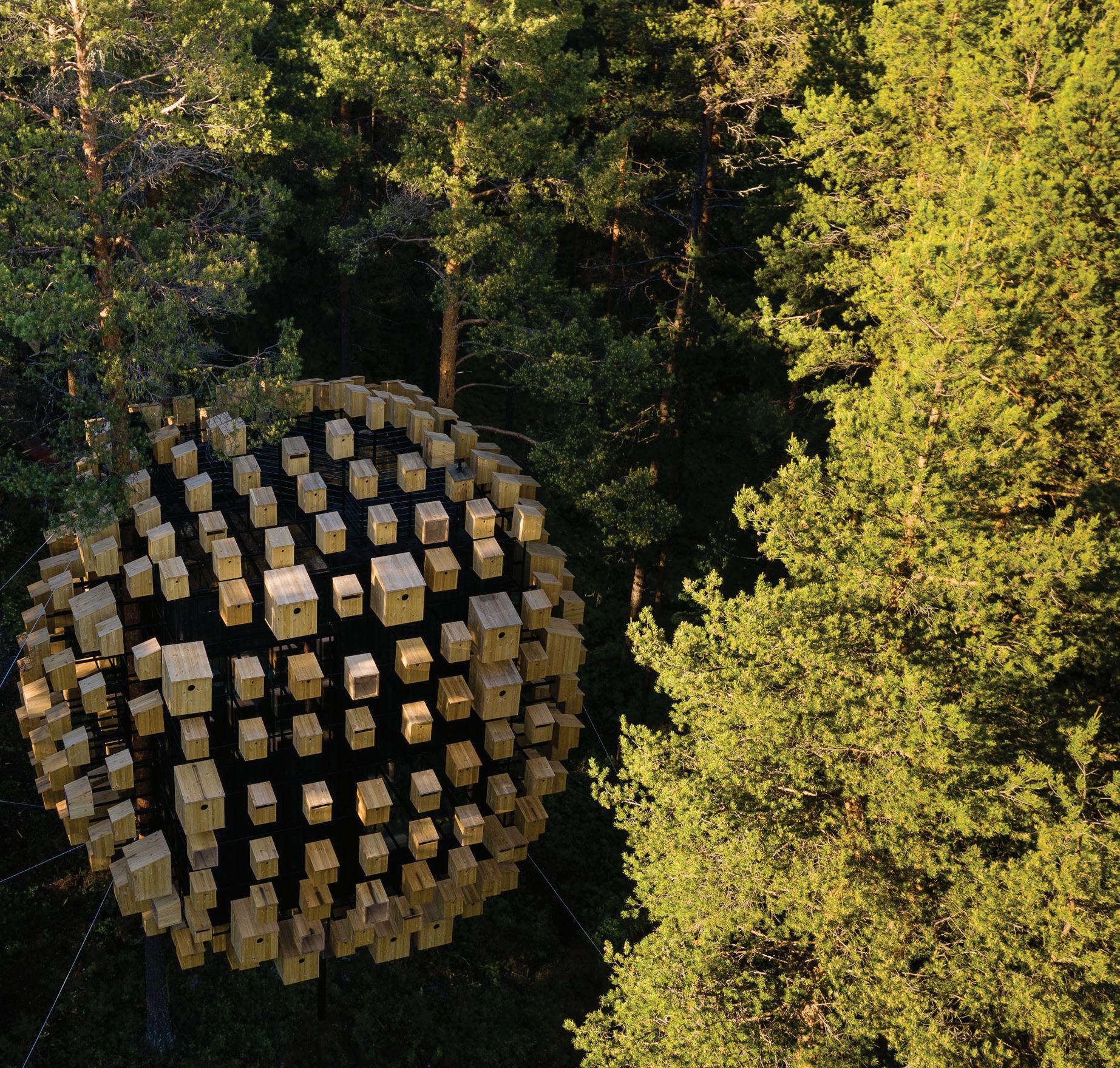 Biosphere amplifies Treehotel’s focus on sustainability and natural tourism, helping facilitate the conservation of the local bird population. With a façade containing 350 bird nests, Treehotel aims to decrease the downward spiral of the bird population in the Swedish woods and strengthen the biosphere and natural habitat.
